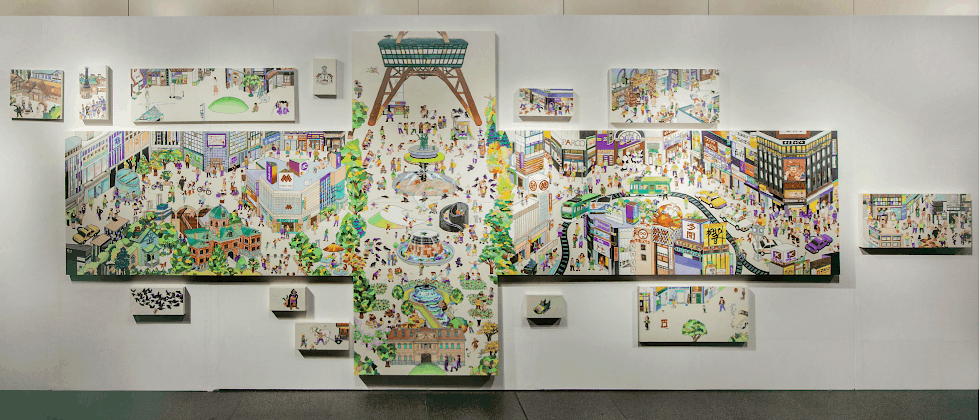 ※参考作品「札幌Life」札幌の街を歩き、取材しながらその日ごとに出会った方や出来事、印象的なお店や風景を描き足して出来上がった作品。今回のプロジェクトではH1mxW4mの画面に、参考作品の様に上下左右画面を足して描いていきます。