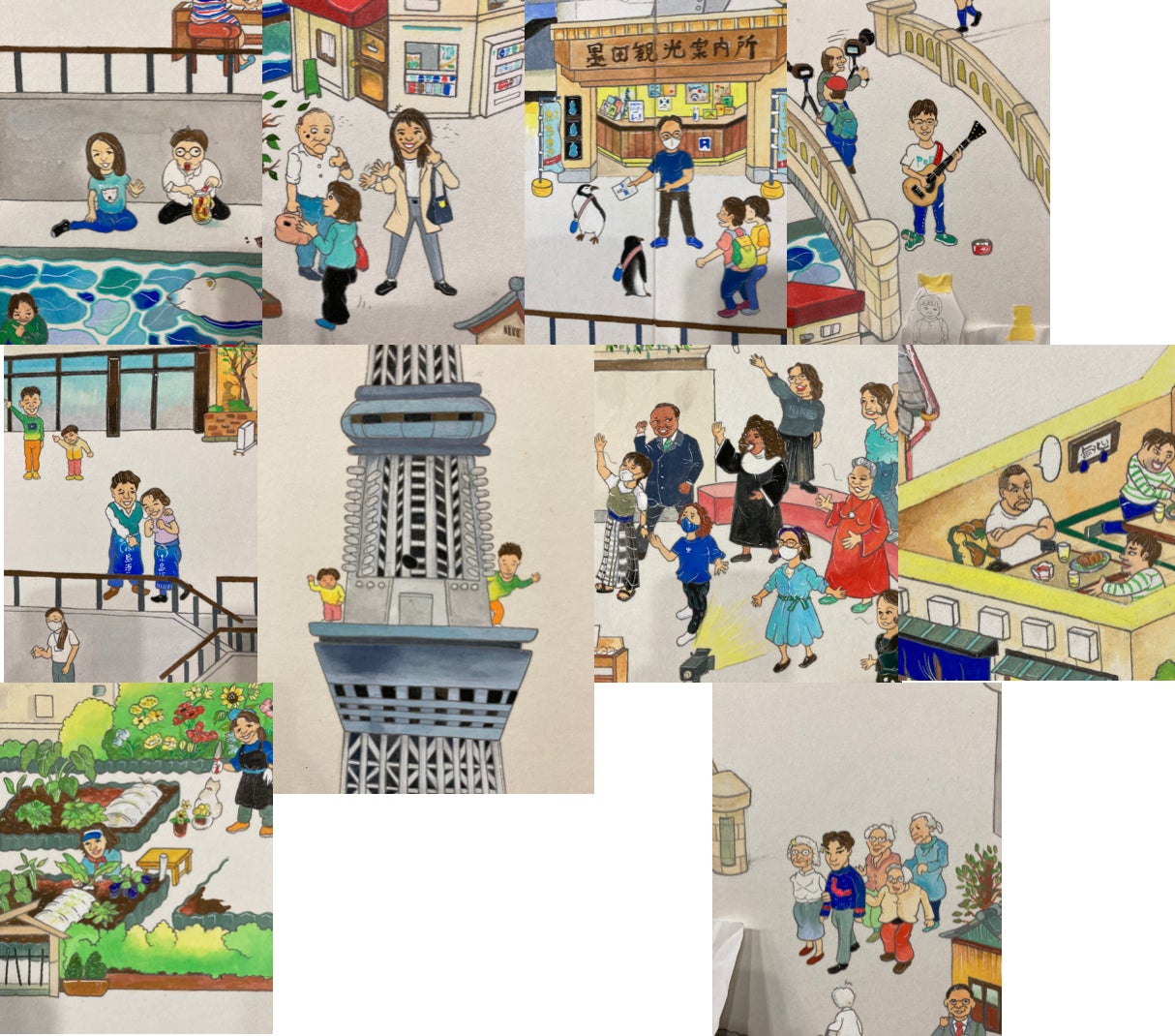 あけましておめでとうございます!少しづつではありますが、墨田絵の全体像が見えてきましたので報告させて頂きます!個々のパーツを配置しながら描き進めていくのはいつもの描き方とは異なりますが、街の中で知らない人同士の思い出が隣あったり、絡んだりしていく様子は絵をとても豊かなのもにしてくれます。