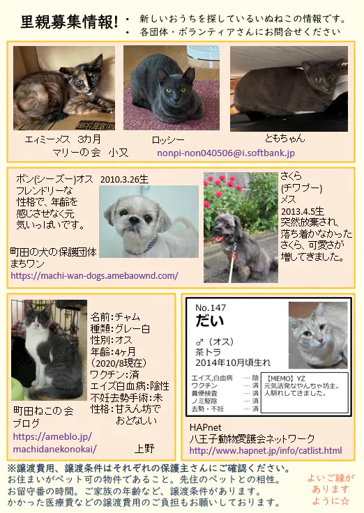 今日は、ふれあ3号に掲載の里親募集情報をご紹介いたします。