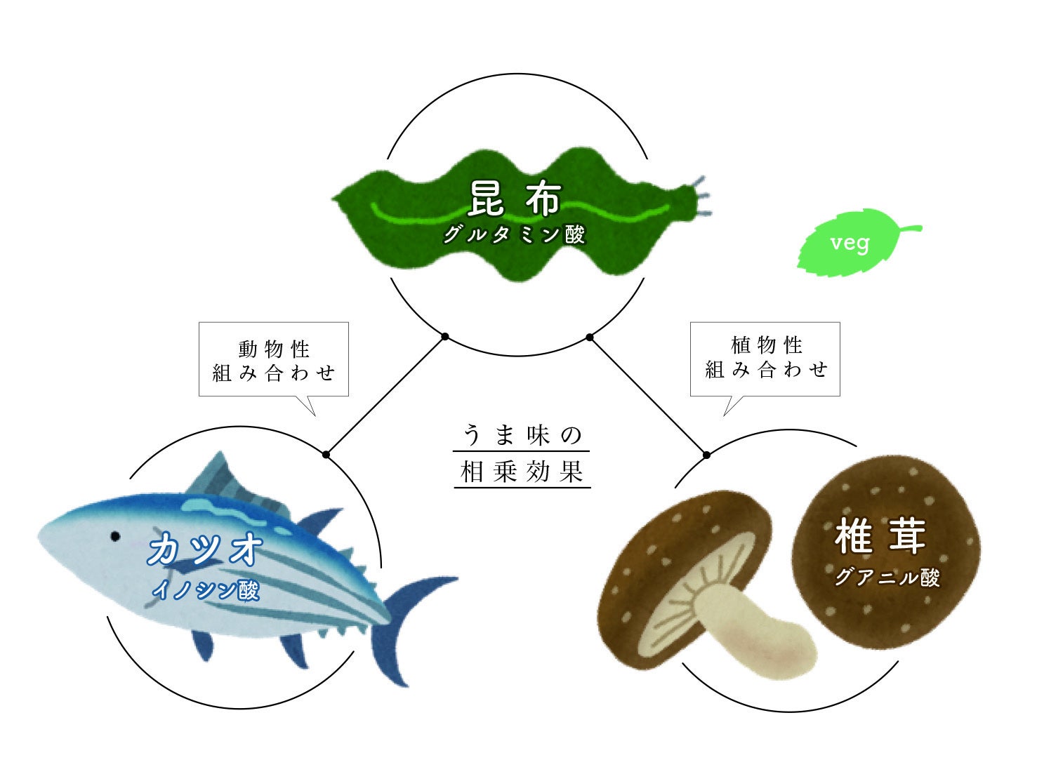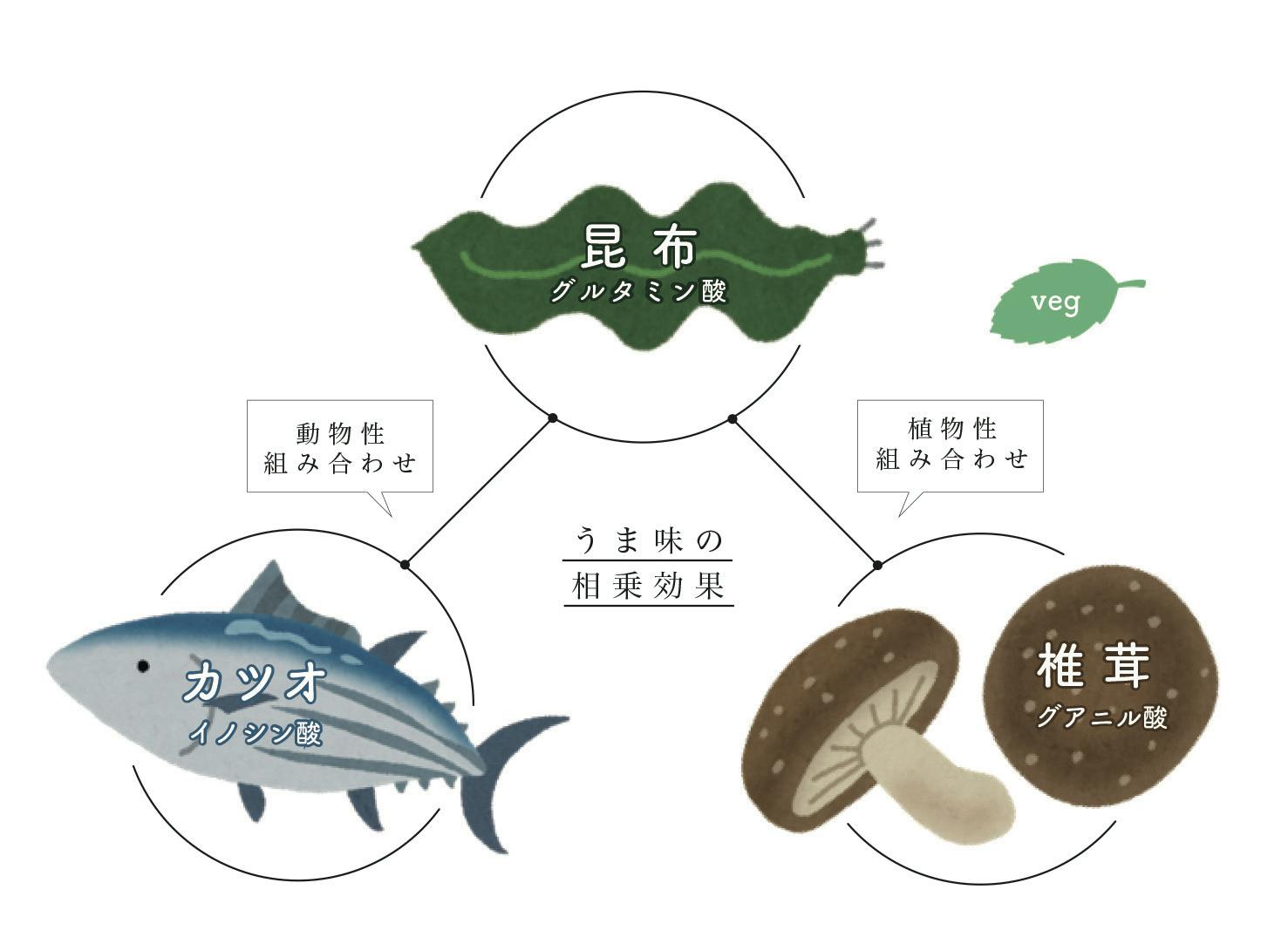 なぜ鰹節など、動物性の出汁が多いのかというと、昆布や野菜に含まれるうま味成分と、動物性のうま味成分が合わさることで相乗効果を生むためです。