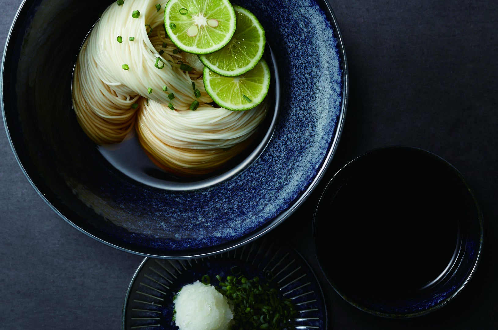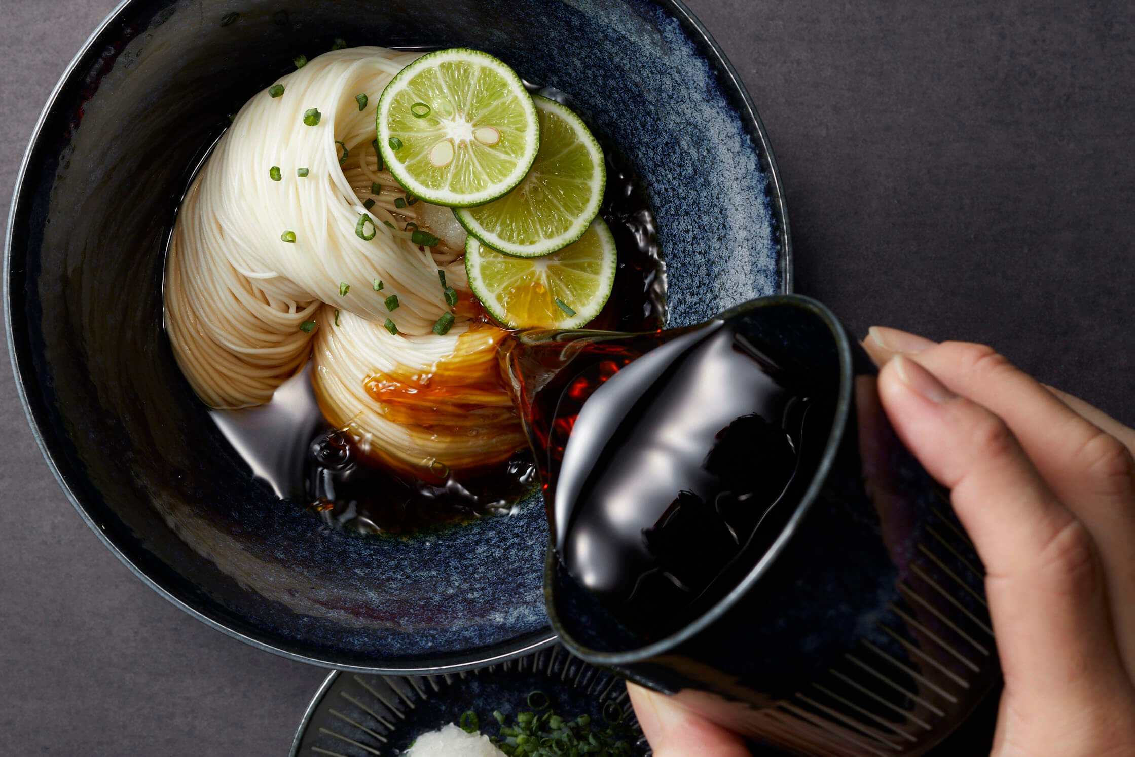 氷水でキリっと冷やしたそうめんに、柑橘を絞り、おいしい椎茸だしをかける。