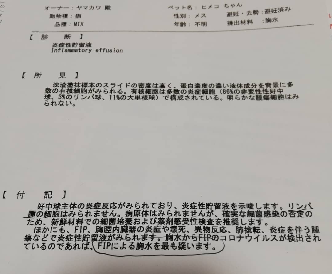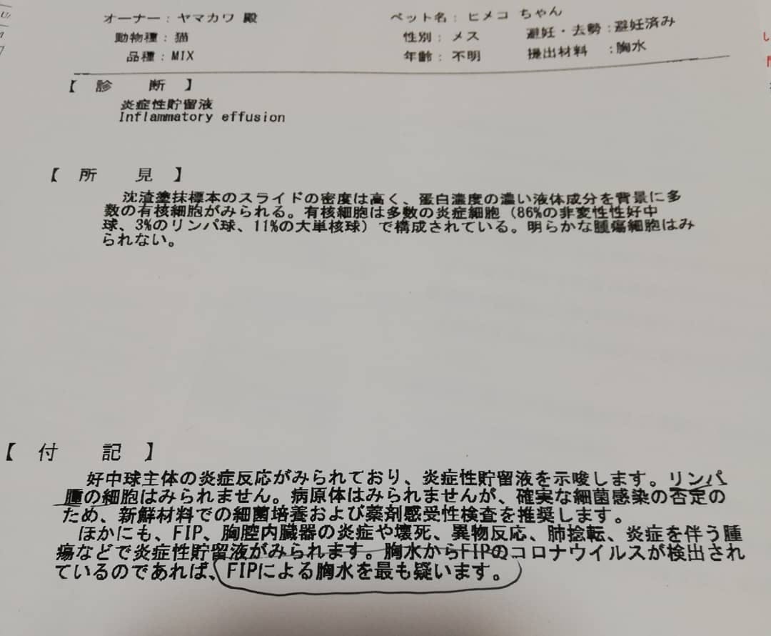 胸水がたまっており、血液検査の結果、FIPと言われる。