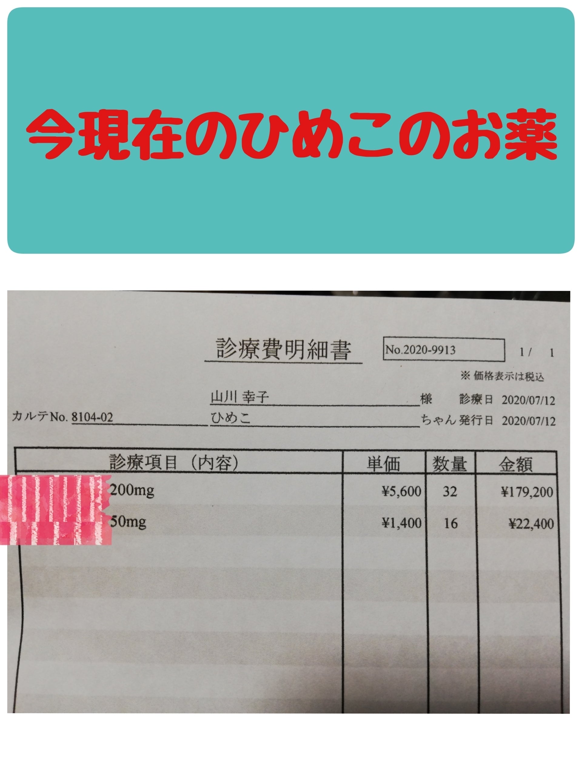 こちらは、ひめこの治療を始めるにあたって、病院に出してもらった、投薬終了までの体重が増えることを想定しないで出してもらった、見積書です。今は体重も増えて、50ミリのお薬が1粒プラスされています。