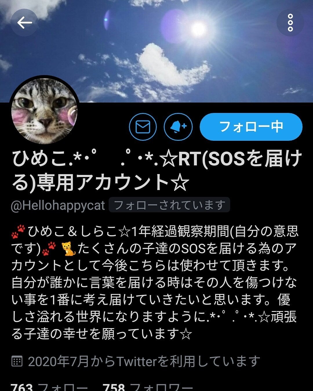 2021/01/23 17:02こんにちは。今朝からひめこのアカウントにもどれません。ひめこのアカウントをもう1つのアカウントから、見ることは出来るのですが(泣)戻り方もわからないし、ギガが全然ないので、ゆっくり調べることもできません。来月ギガが復活したら、ゆっくり調べます。本当にSOSとどけられず、申し訳ありません。 先月末から仕事が全くなく、週1回、もしくは、2週間に1回の仕事になってしまった為、携帯がもしかしたら、止められてしまう可能性もあります。そしたら、しばらくその間は音信不通になりますが、その間にお仕事ある日は頑張って携帯代払えるようにしますので、もしとまってしまったらその時は本当に申し訳ありません(泣)なんとか、出来ることを頑張って止まらなくていいようにしたいと思います。そして、なんとか、ひめこのアカウントに戻ってSOS届けられるよう調べたいと思いますので(泣)しばらくの間、SOS届けられないことお許しください。本当に本当に申し訳ありません。父についてですが、抗がん剤が強くなり髪が抜け始めたみたいで帽子を家の中でも被り頭を隠しています。朝起きて目眩がし倒れてしまう事もあるみたいで。。それでも通院、抗がん剤治療、アルバイトなど頑張っています。なので自分もひめこやしらこ、我が家の子達を守れるよう頑張りますので、引き続き見守っていただけると助かります。ひとまずひめこのアカウントに戻れないのでここでだけの報告になります。本当にSNSとかインターネットとか全然わからなくて申し訳なく思っています。本当にすいません(泣)SOSを届けられないこと本当に申し訳なく思っています。戻れたら、またたくさん届けていきたいと思います。本当に申し訳ありません。たくさんのSOS届きますように.*・゚ .゚・*.☆そしてこの世界にある全ての病気や悲しみや苦しみ。。消えますように。本当に申し訳ありません(泣) もっと見る