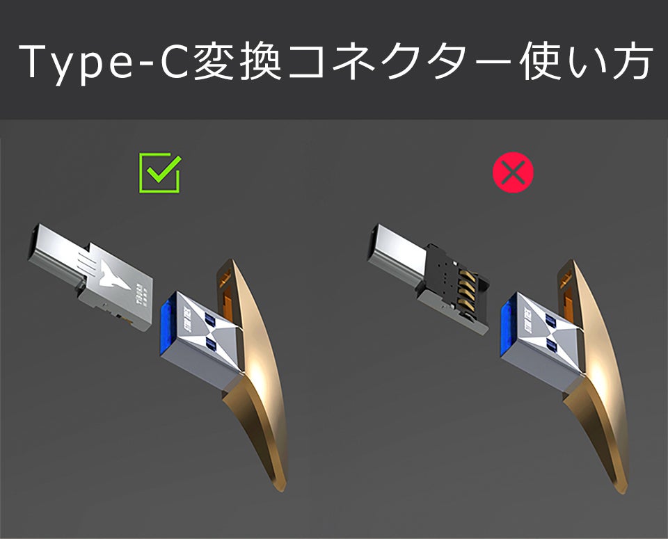 従来のUSBより、コンパクトかつtype-c変換コネクター内臓でより便利に