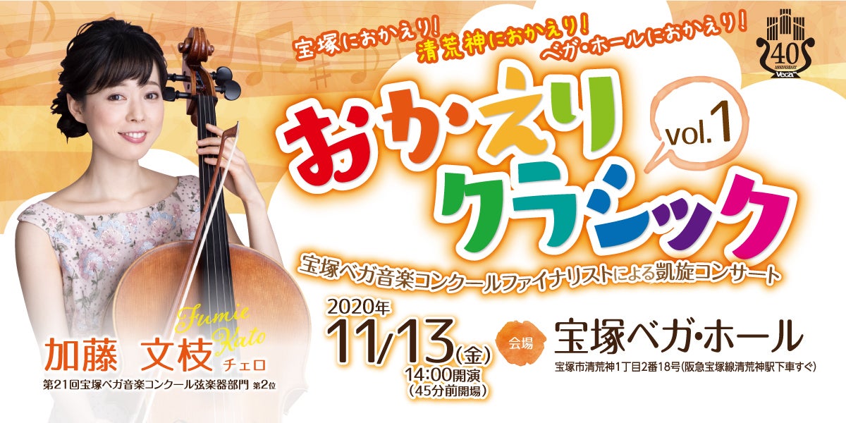コンサート(約1時間半)のライブ中継映像をお届けします。出演はチェロ奏者の加藤文枝さん。オーケストラとの共演など、多方面でご活躍中。宝塚ベガ音楽コンクールでも第21回の開催で第2位でした。久しぶりの宝塚での凱旋コンサートです。「暗いニュースが多い中、重苦しい気分をチェロの暖かい音色で吹き飛ばし、皆様の心が潤いに満たされるようホールいっぱいに音を響かせたいと思います」とコメントを頂いています。