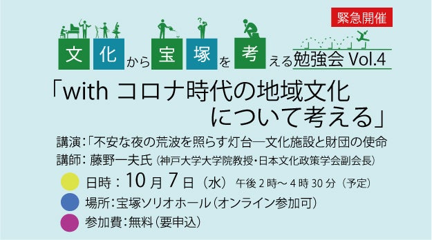 新型コロナウイルス禍による公演や展示の中止が世界中で相次ぎ、宝塚市においても、文化施設の臨時休館や多くのイベントが中止や延期を余儀なくされ、社会全体への影響と同様に、文化、芸術関係者にも深刻なダメージを与えています。 このため、大阪府内・兵庫県内の文化芸術関係者に対する新型コロナの影響調査に関わり、文化政策が専門の神戸大学大学院教授 藤野一夫氏をお招きし、勉強会を緊急開催することになりました。基礎自治体における文化政策の重要性とコロナ禍による文化芸術関係者への影響についてご講演いただき、この危機をどのように乗り越えていくかについて共に考えます。 「文化から宝塚を考える勉強会VOL.4」10月7日(水)14時~この勉強会で、今回のプロジェクトのPRをさせていただきます!