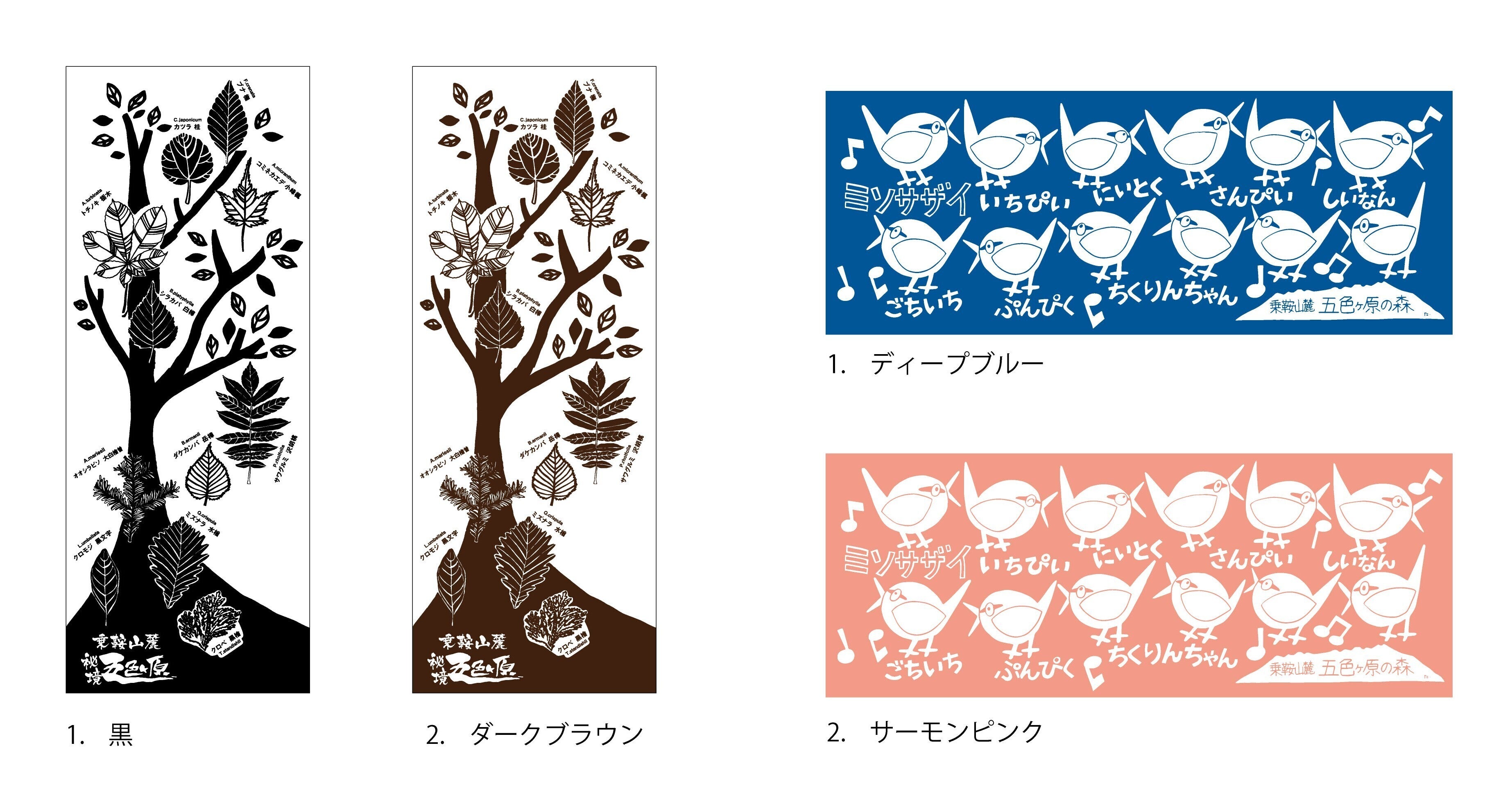 リターン品の手ぬぐいの色が決まりました!2種類展開の4色です。案内人の中には陶芸家だったり、革細工職人だったり、ガラス製品を作れたり、狩猟免許を持っていたり、山岳ガイドで北アルプスを練りまわっていたり、スキーインストラクターだったりと、たくさんの顔を持つ名人がいます。今回の手ぬぐいデザインは、まず女性案内人の意見を取り入れるところからスタートしました。様々な意見がある中、経費や予算の兼ね合い、製作期間・納期などを算出したうえでロット数を決め、デザインの忠実性をたもちつつ、素材選び、染めの方法など、一つ一つ決めていきました。その為手こずることも多々あり、本デザインの作成者らには大変な苦労をかけました。その分とても良い仕上がりになるだろうと思います。①木のデザイン:五色ヶ原の森を代表する広葉樹・針葉樹をテーマに、森のたくさんの息吹を感じるデザイン。葉の横には学名と名称が書かれており、学習用としても役立つデザインです。ステンドグラスを扱うガイドと樹木好きなガイド発案の作品です。②鳥のデザイン:小さな野鳥ミソサザイの鳴き声が楽しく描かれたデザイン。耳を澄ませると、こんなふうに聞こえてくるから不思議です。五色ヶ原の野鳥の先生ともいうべきガイドと美術教員だったガイドのコラボ作品です。※今回はランダムでご支援1口につき1枚発送させていただきます。 デザインはお選びいただけませんので、ご了承ください。↓五色ヶ原の森の物語が詰まった手ぬぐいがもらえる¥3,500のご支援はコチラ↓https://camp-fire.jp/projects/view/309706※Tシャツと手ぬぐいセットのリターン品もございます。