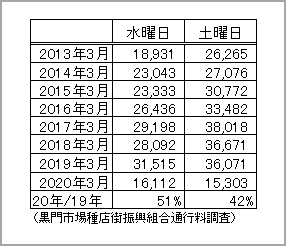 人通りが殆んどない黒門市場の最近の風景 しかし、新型コロナウィルス感染による中国、韓国からの入国禁止などの影響により、毎年行っている3月の定期的な通行量調査では対前年同月比0.511倍と激減しました。4月以降はその後の外出自粛後は、外国人だけではなく、国内のお客様も殆ど見当たりません。