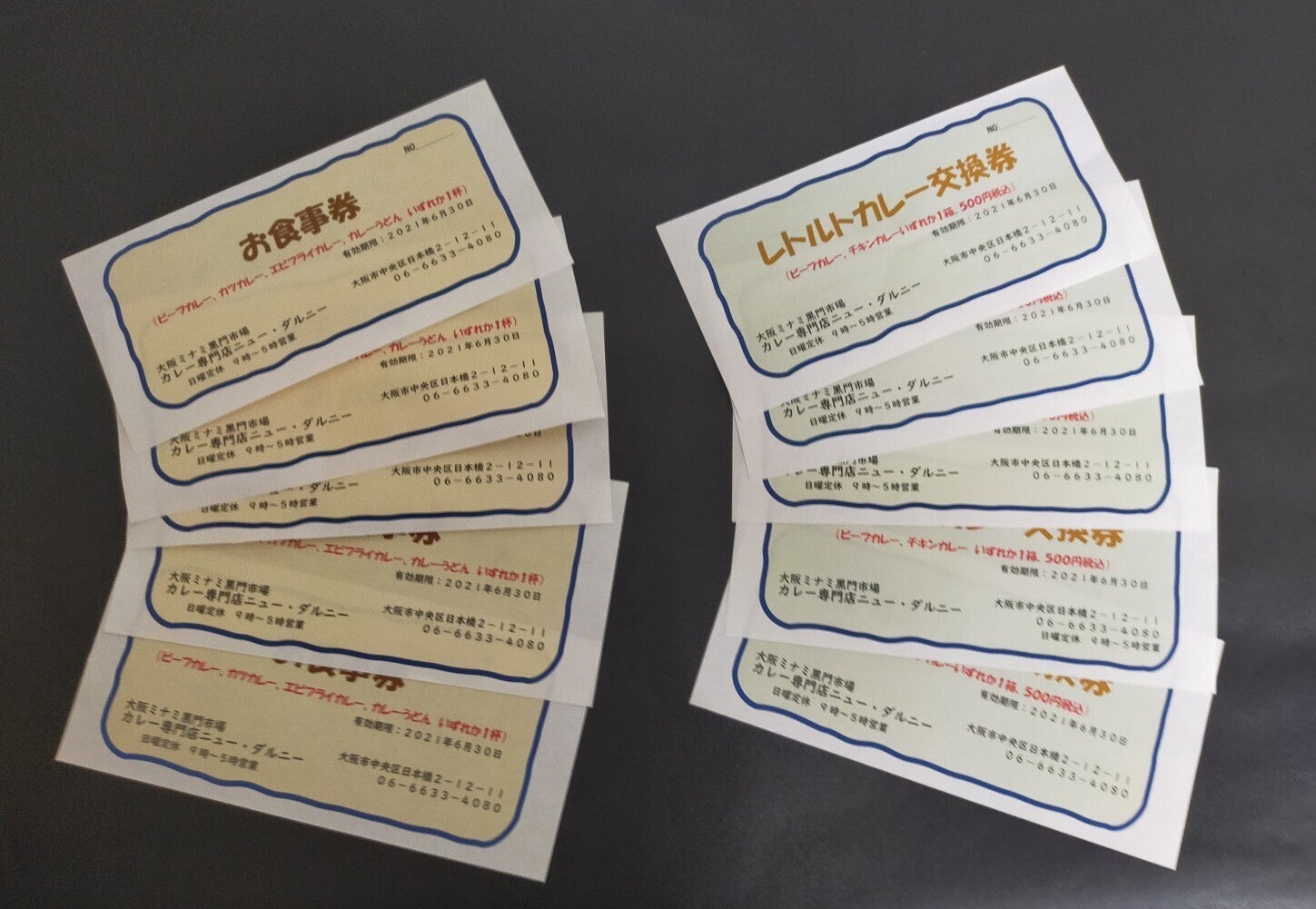 コロナが落ち着いたら皆様に黒門市場に来ていただき、激減した外国人観光客に頼らず国内のお客様で昔の賑わいを取り戻したい。そして私たちのお店のカレーを食べていただきたいのが一番実現したいことです。「お店で使える使えるお食事券」 と「レトルトカレー交換券」を持ってニュー・ダルニーにおこしください。