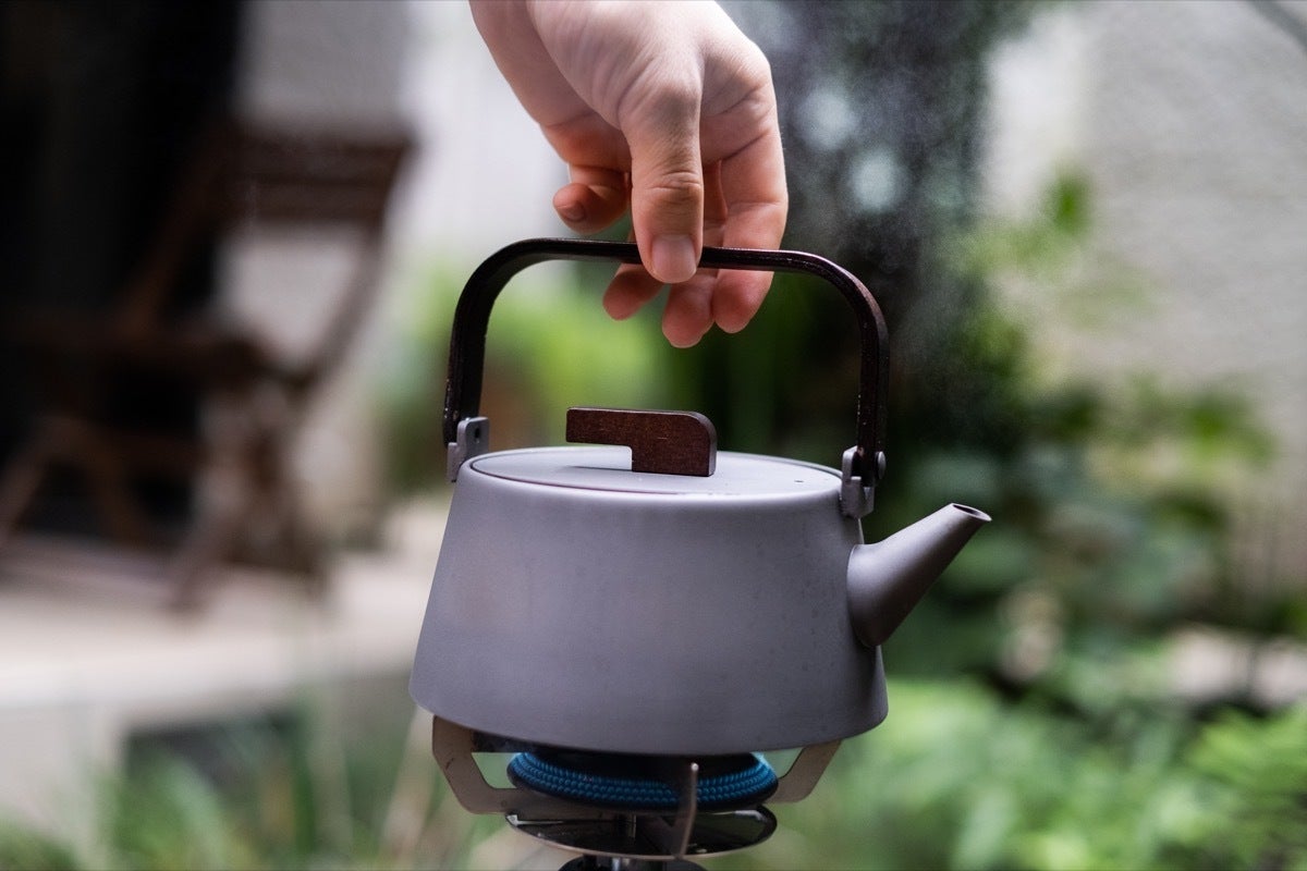 チタン素材がもたらす軽量性で持ち運びがしやすく、取手の部分が木製のため、熱いお茶を注いでも手に熱が伝わることはありません。直接直火で加熱することもできるため、アウトドア環境での使用にも向いています。