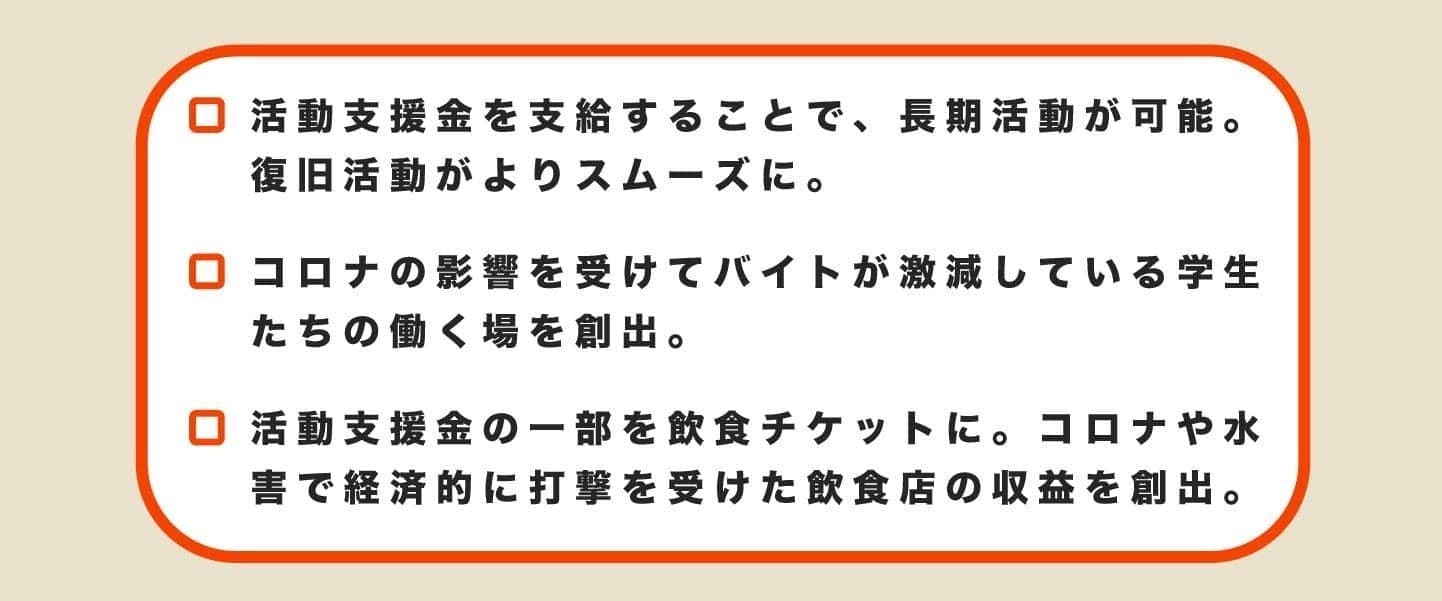 この活動に参加してくれた学生には、活動支援金だけでなく、熊本支援チームがこれまで培ってきた災害支援活動のノウハウや地域課題解決の心得、また、県内コミュニティとの接点を提供することで、これから日本各地で起こるであろう災害や有事に率先して動ける人材を育成し、地域リーダーとしても活躍できる人材を輩出することも期待しています。
