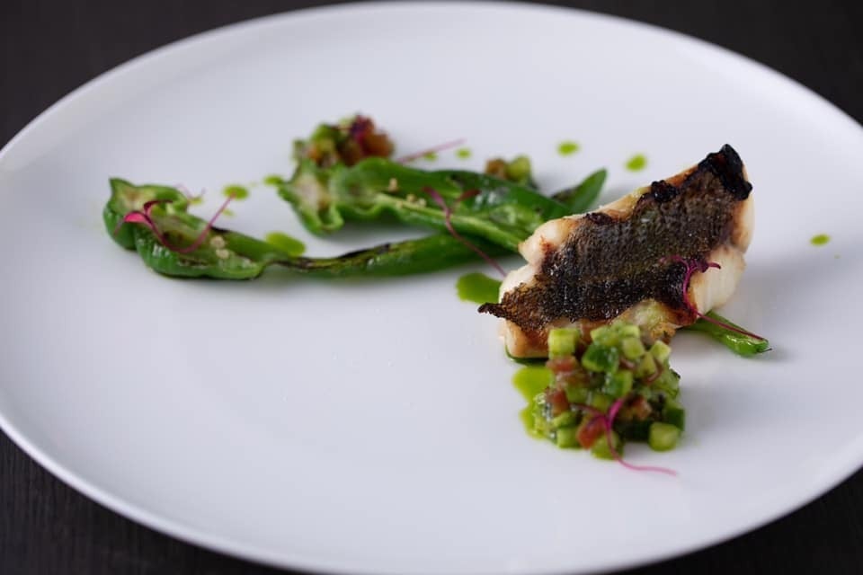 イサキと万願寺唐辛子の網焼き 胡瓜、キウイフルーツ、トマトのヴェルデソース