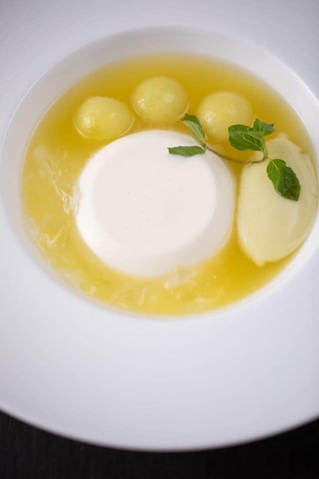 ブランマンジェとスプマンテのゼリー マスクメロンの実とそのスープ仕立て