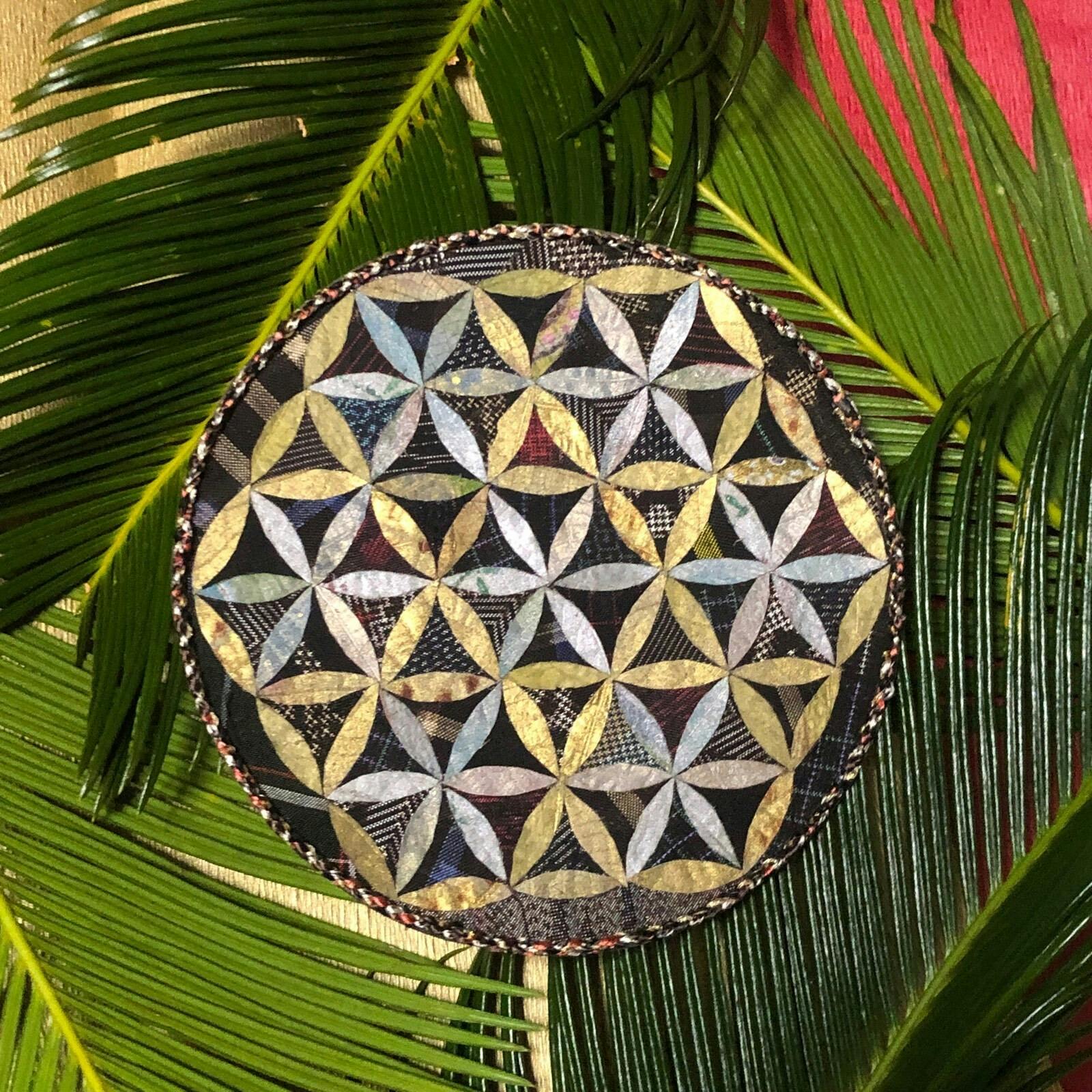 黒ベースの大島紬布に金銀が映えます。縁取りは大島紬糸を編み込んだ紐です。綺麗で落ち着いた雰囲気の葉っぱ曼陀羅が完成です。