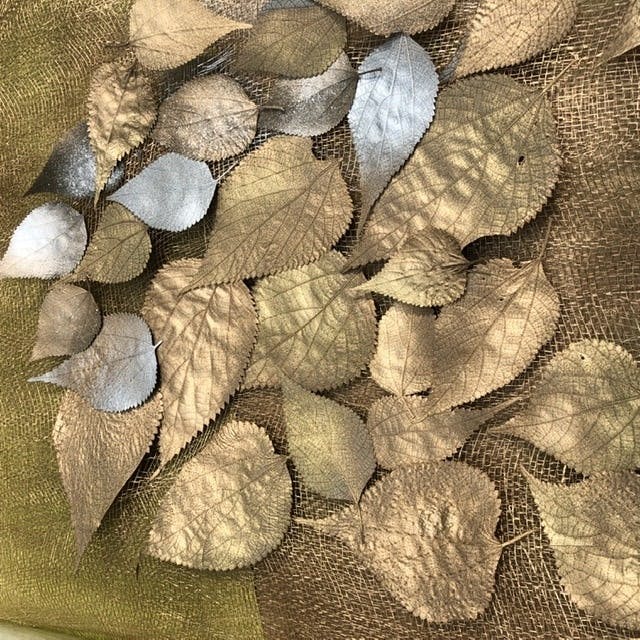 金色、銀色、真鍮色、それぞれだったり、所々混ざっていたり…大中小の葉っぱにスプレーする作業をしました。