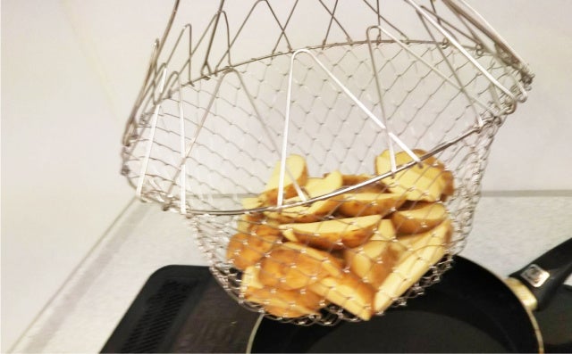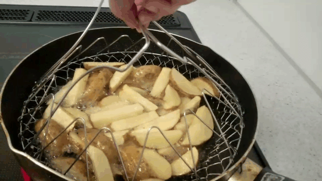 フライドポテトや唐揚げをのせて、そのまま鍋に入れるだけ!油がぐつぐつ煮え立っていても持ち手は冷たいまま。素早く簡単に移動できて火傷の心配も減ります!