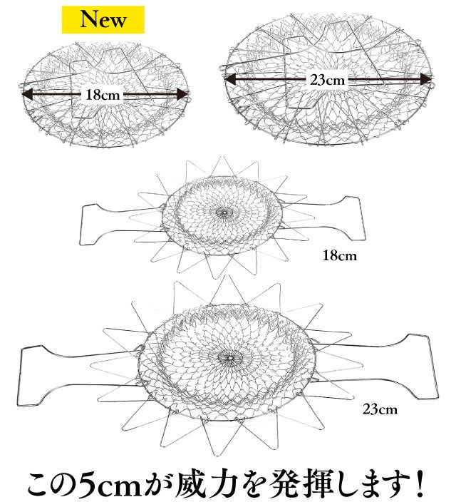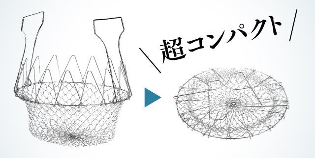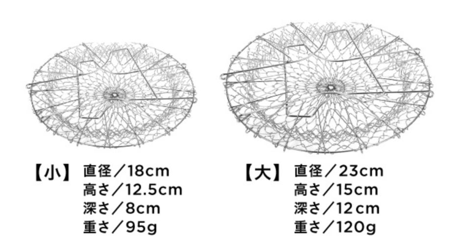 折りたためば直径23cm(大)と18cm(小)の平らな円形ですが、拡張型の持ち手を広げれば、鍋やフライパンにフィット!持ち手を掴んで素早くに簡単にバスケットを持ち上げることができます。