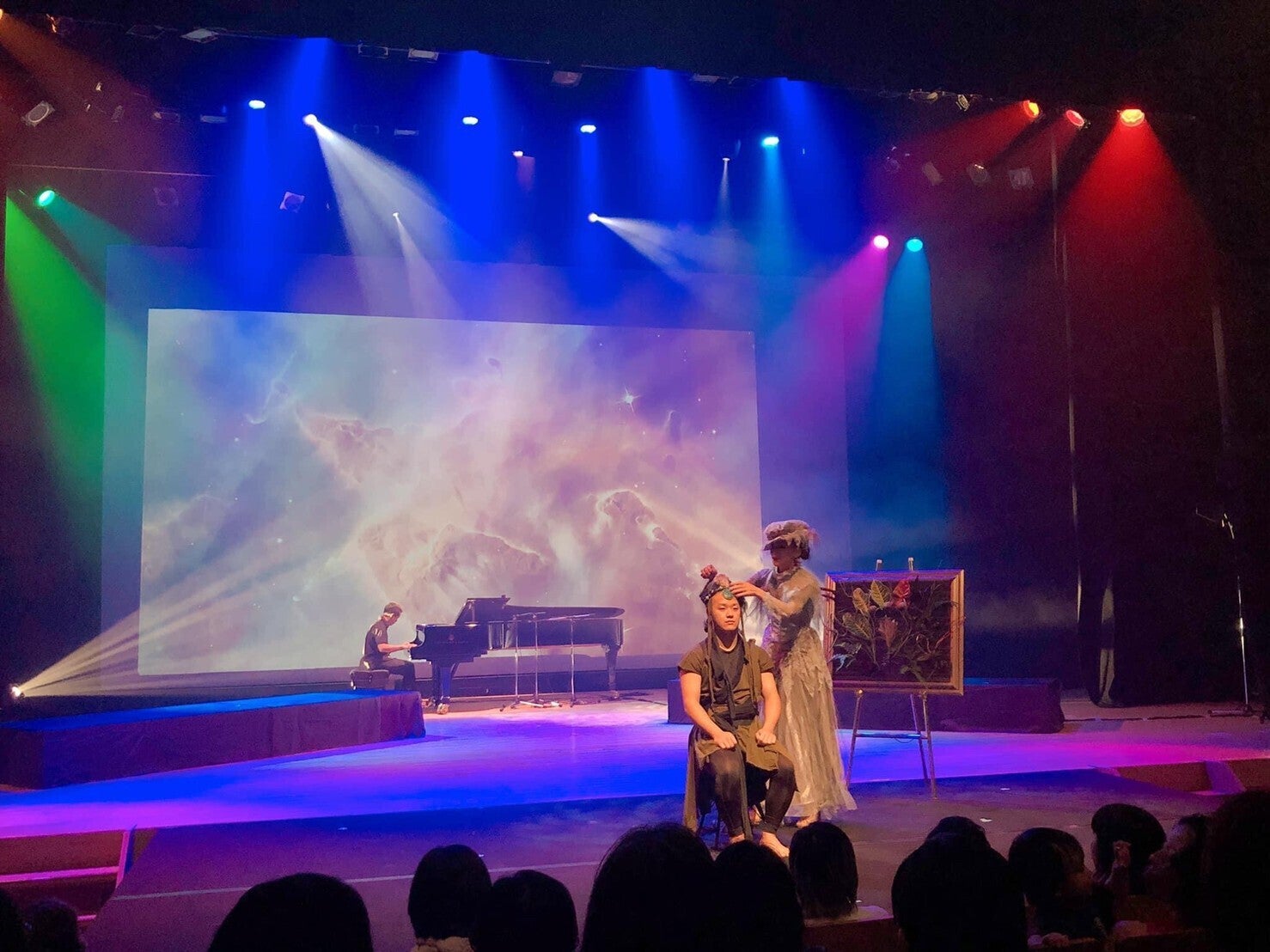 空間パフォーマンスに音、映像、髪(神)のショー、