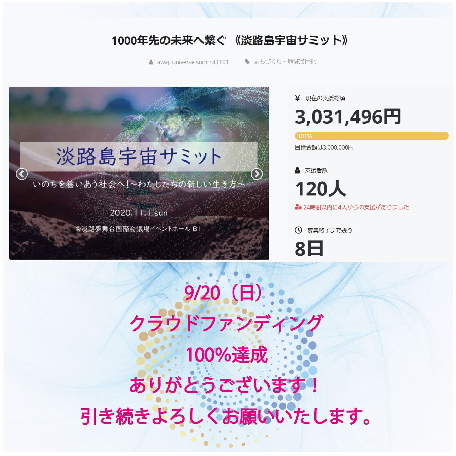 2020/09/20 21:37ありがとうございます!!淡路島宇宙サミットクラウドファンディング!!目標の100%達成致しました!皆様のご支援、応援のおかげでございます!クラウドファンディング終了まで8日。最後まで、淡路島宇宙サミットにクラウドファンディングに興味と応援をして頂けます様に、発信して参ります。どうぞよろしくお願い致します。 もっと見る