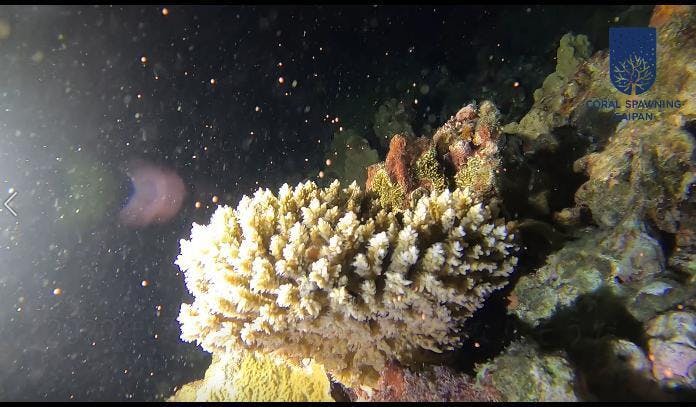 人知れず、夜の海でにひそかに小さなピンク色の卵が1つ、2つと母なるサンゴ本体から離れて浮き上がり、しだいにあたり一面に広がって、ゆっくりと流され旅立っていきます。