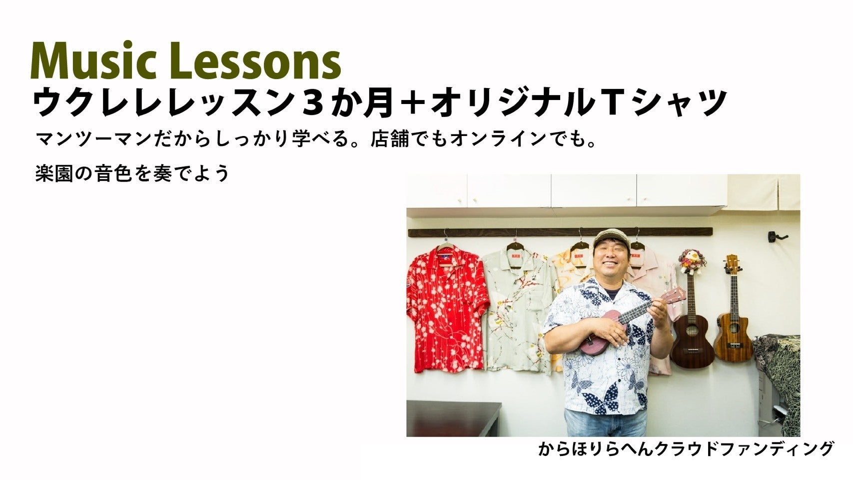 という方におすすめのリターン”◆ウクレレレッスン3ヶ月+オリジナルTシャツ(からほりらへんPASS付)◆ “