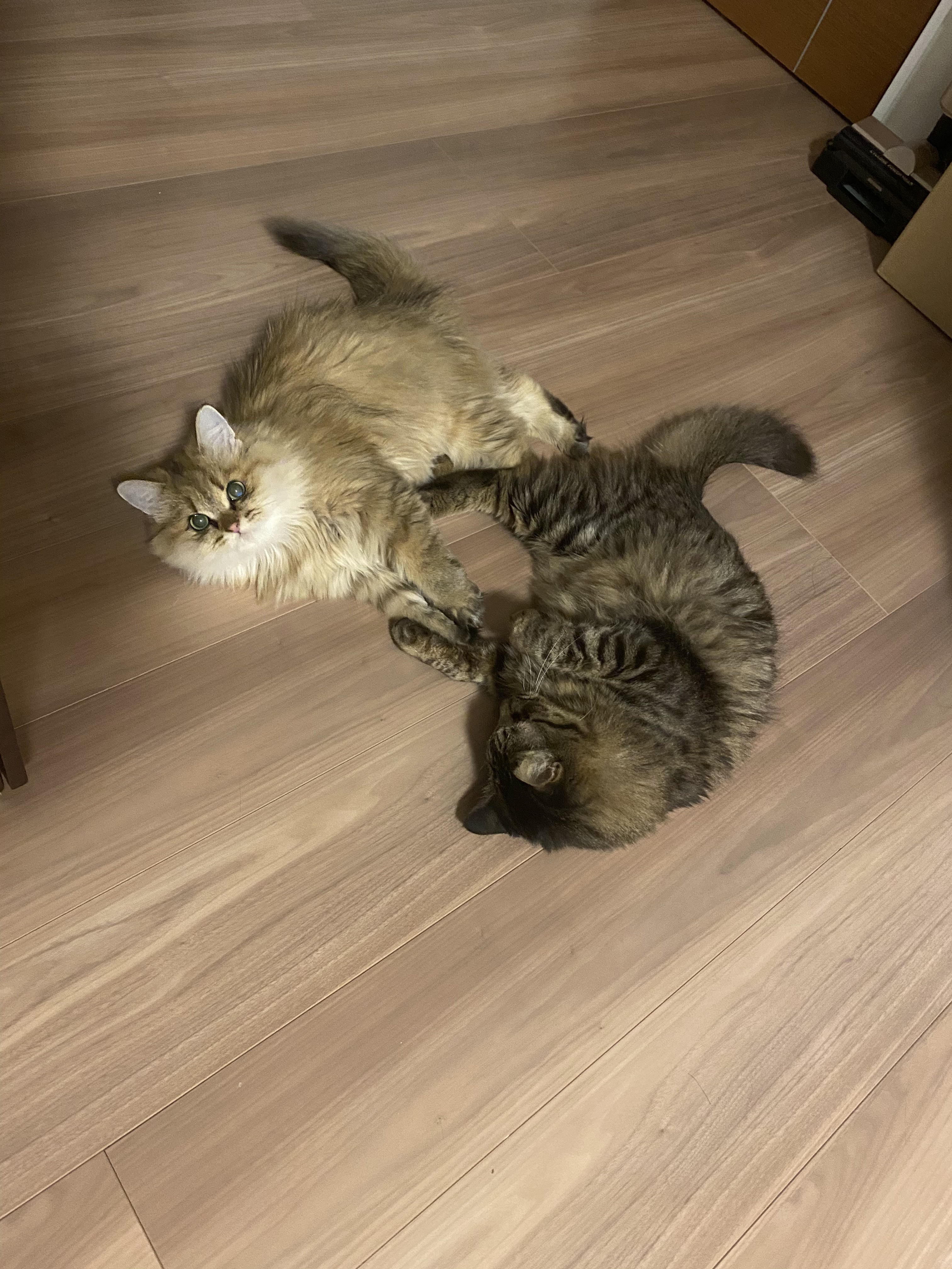 乱闘からの〜(かぐらさんカメラ目線笑)腹見せ 笑モフ対モフモフの決着はいかに、、最近順調に投薬していたのにカミカミされて口の周りがまっきっき!私の手もまっきっき!!!あの黄色い色素は只者ではない。