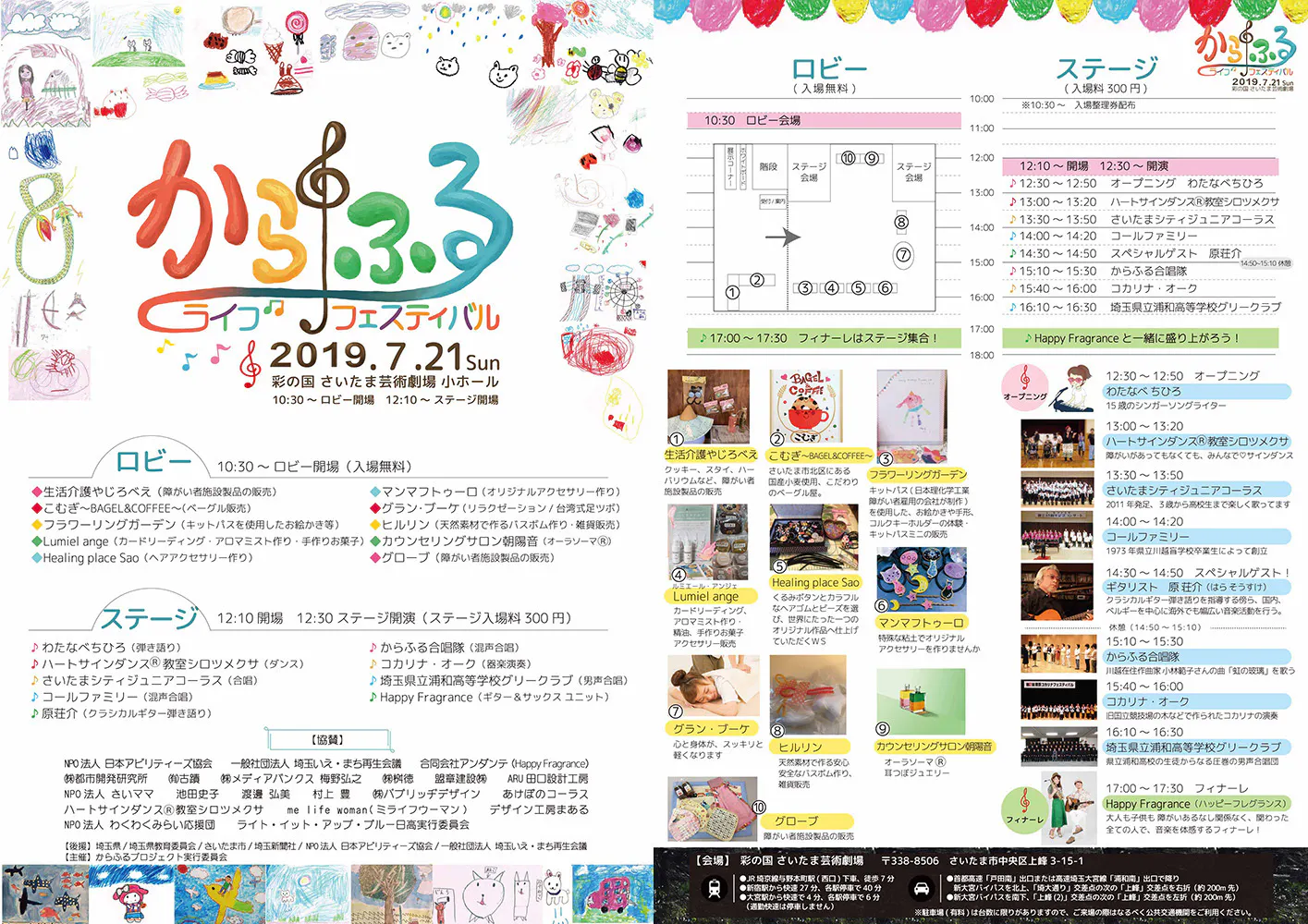第1回「からふるライブフェスティバル」は、2019年7月21日、彩の国さいたま芸術劇場小ホールで開催。後援は、埼玉県 / 埼玉県教育委員会 / さいたま市 / 埼玉新聞社 / NPO法人 日本アビリティーズ協会 / 一般社団法人 埼玉いえ・まち再生会議 / 北浦和GINZAレッズ商店会からいただきました。