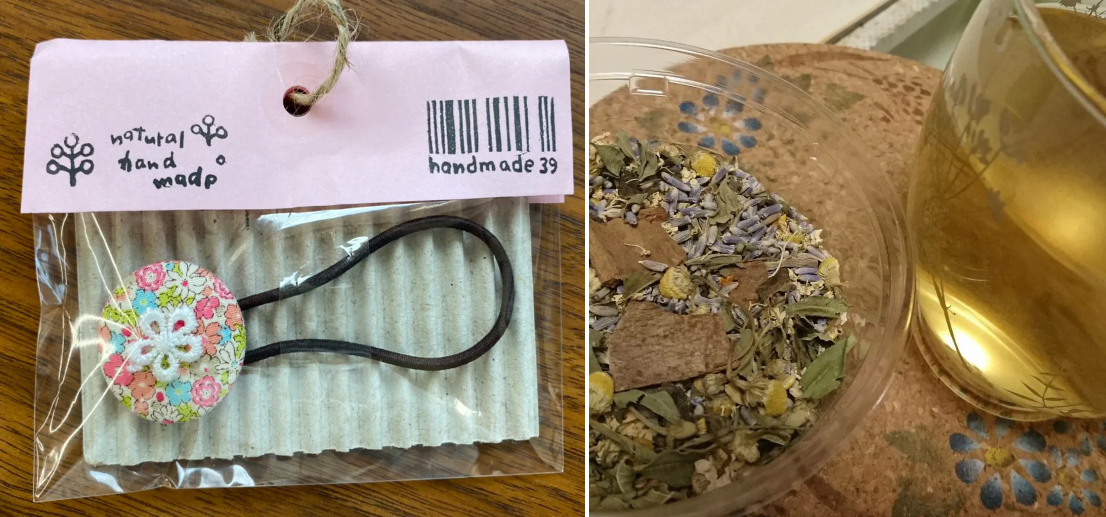 障がい者就労支援施設で制作した、一つ一つ心のこもったオリジナル制作物です。くるみぼたんのヘアゴム、ぽち袋、ハーブティーバッグ、アロマストーン、クッキーなど。この中からランダムにお送りします。何が届くかは開けてからのお楽しみ(o^^o)です。