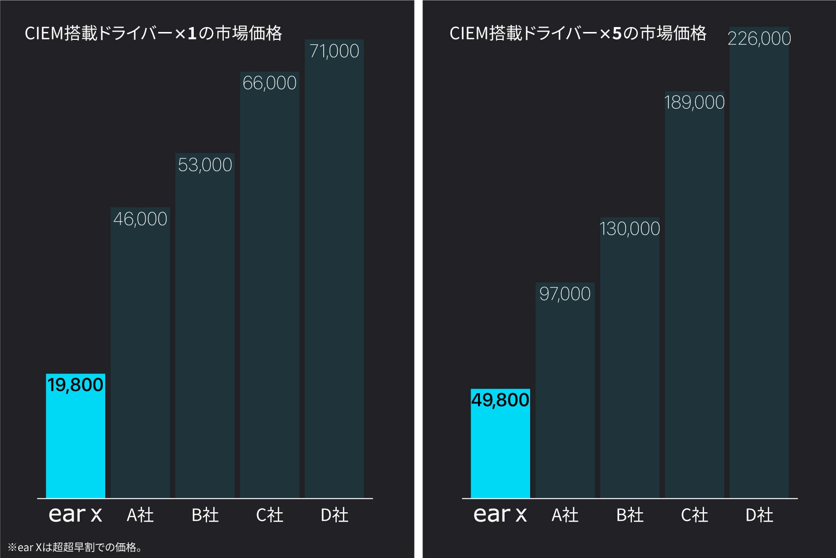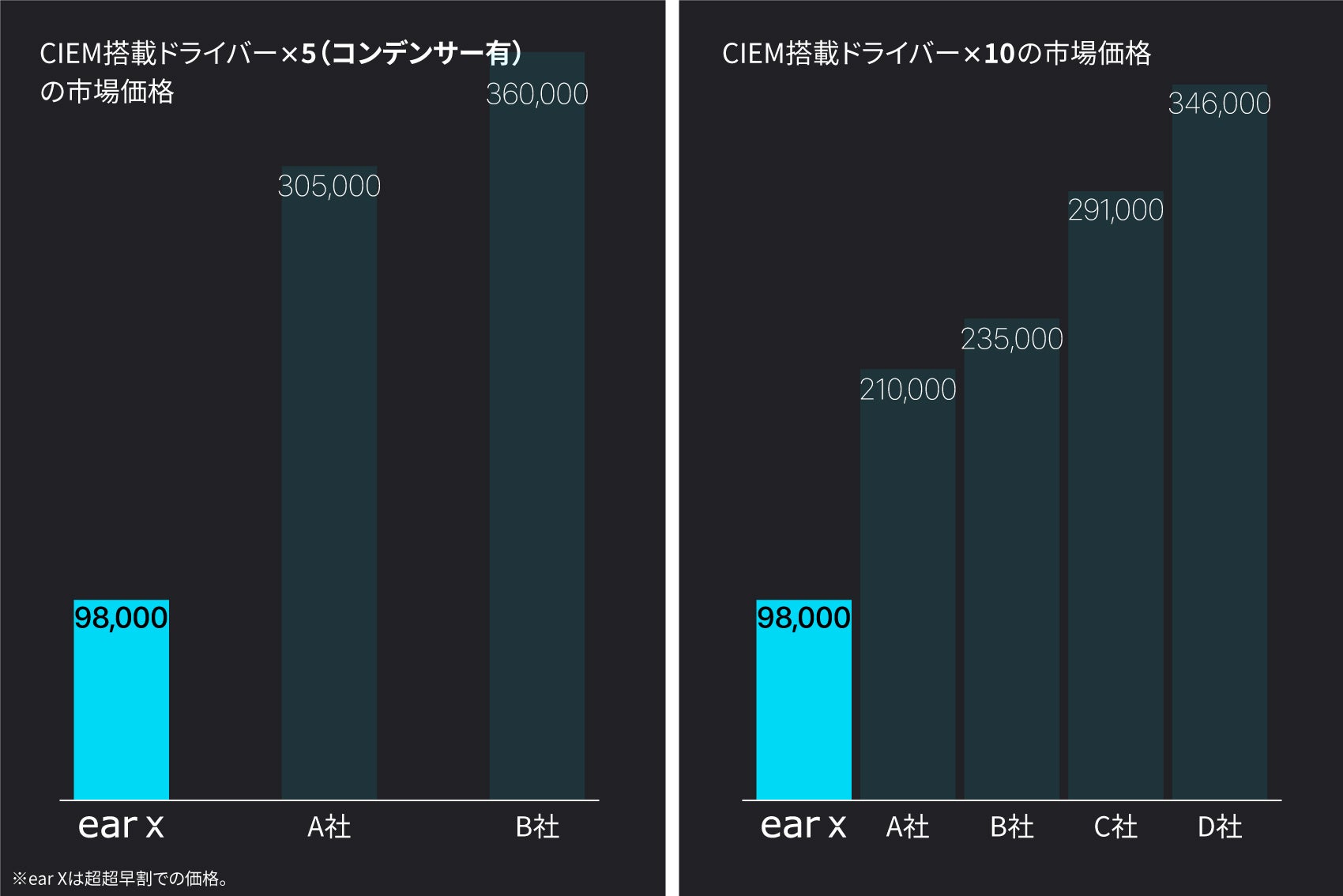 前述の理由により、他社CIEMに比べると圧倒的に価格を抑えることに成功し、これまでのカスタムイヤホンの常識を打ち破ることができました。低コスト化によって、これまでのマニアックなユーザー層のみならず、多くの人の手に渡るべく、価格に挑戦しました。以下の同ドライバー数CIEMの比較をみれば一目瞭然です。