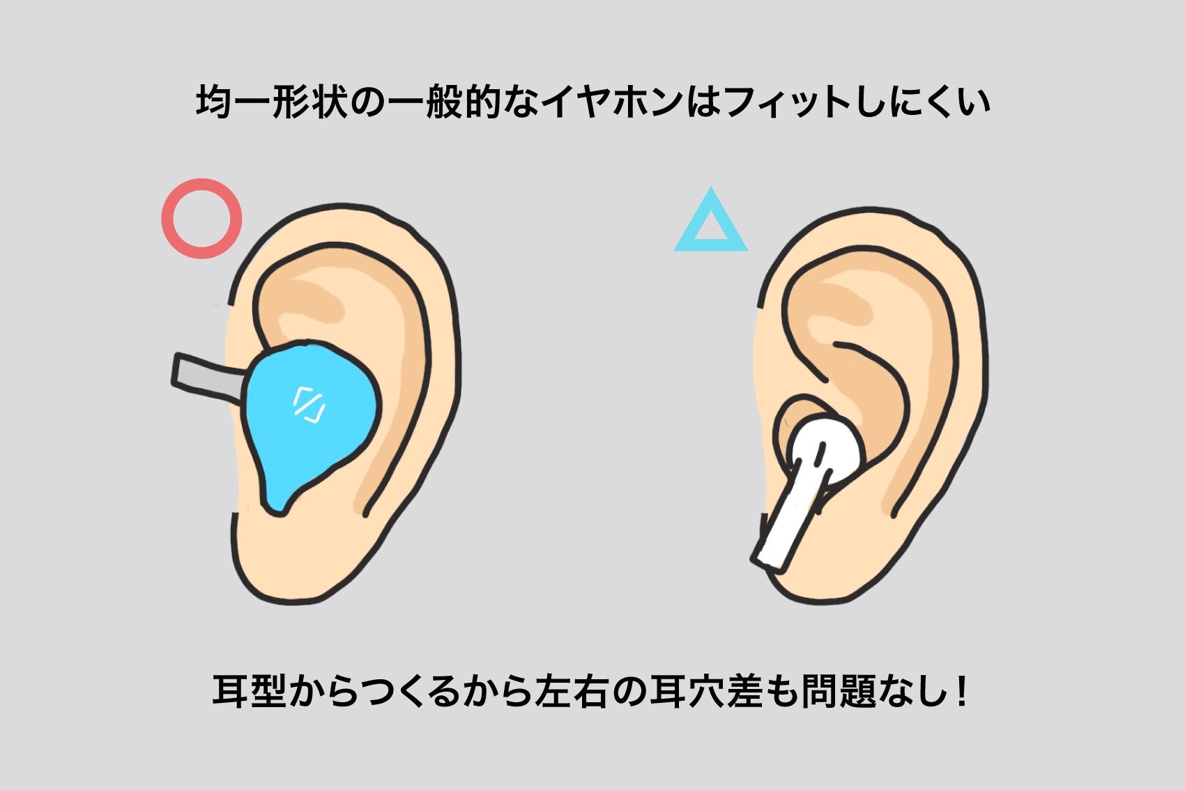 それは実は当然のことで、人の耳の形は千差万別であり、さらに言うと左右でも耳の形・穴の大きさが違うから。均一な形状のイヤホンが自分の耳にしっくりこないのはこのためです。