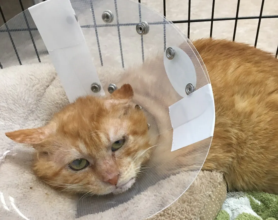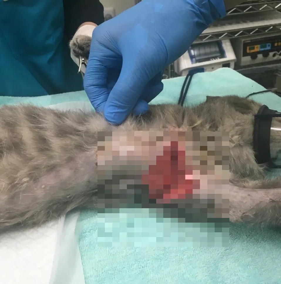 脇の部分の赤身が大きく露出しており、動物病院で2度も縫合していただき、今は傷が癒えるのを待っているところです。