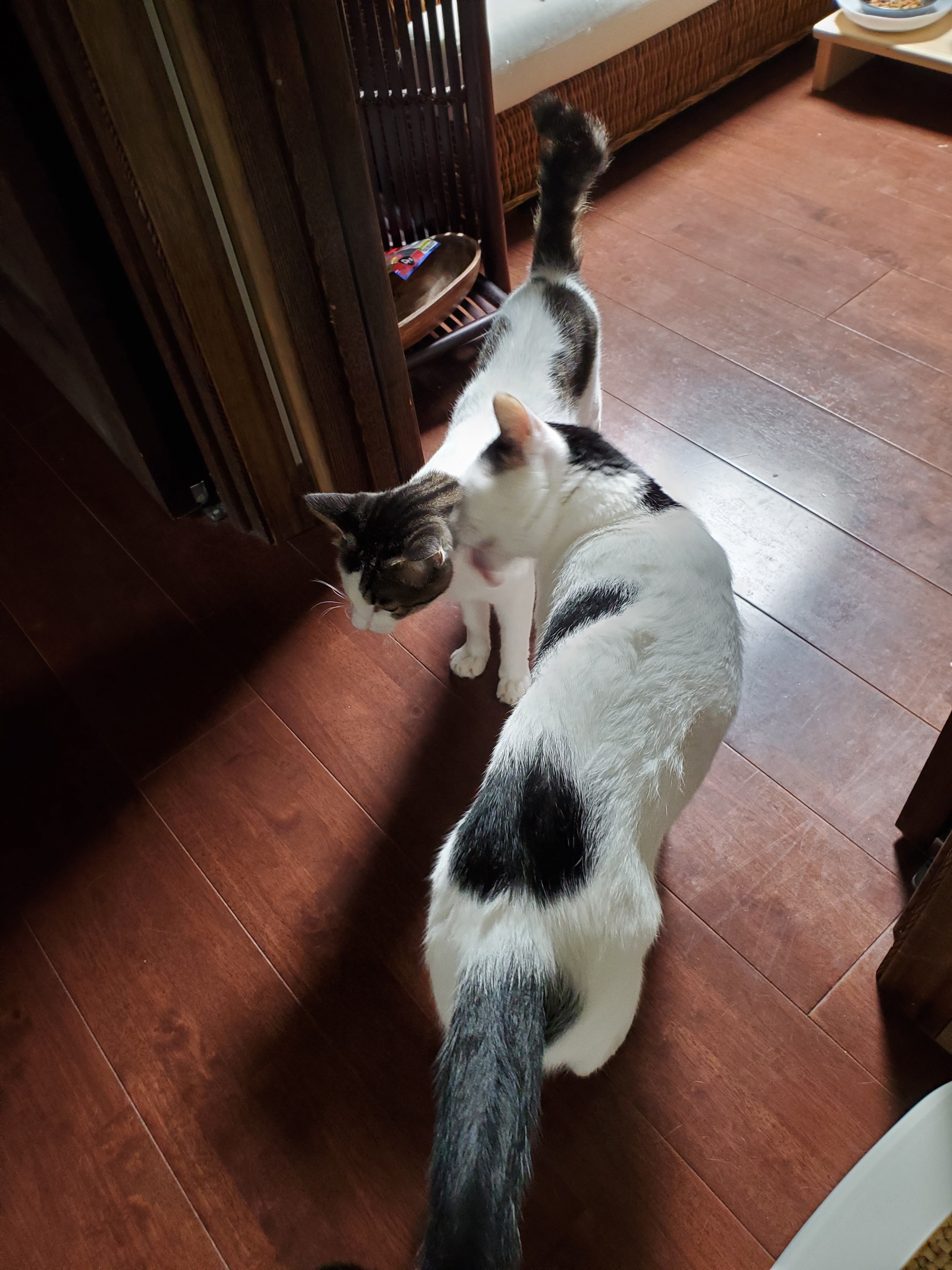 さすがのマメもちょっと心配している様子?(๑´ㅂ`๑)(3.5キロ程のぶっちゃんと 6キロちょっとのマメの大きさの違いが・・・(゜∀。))
