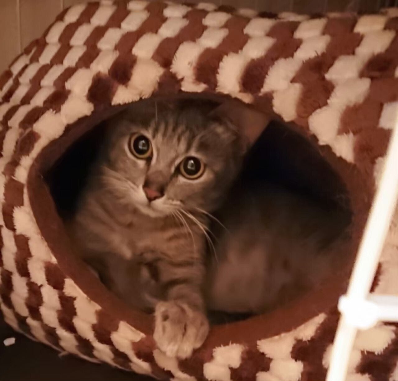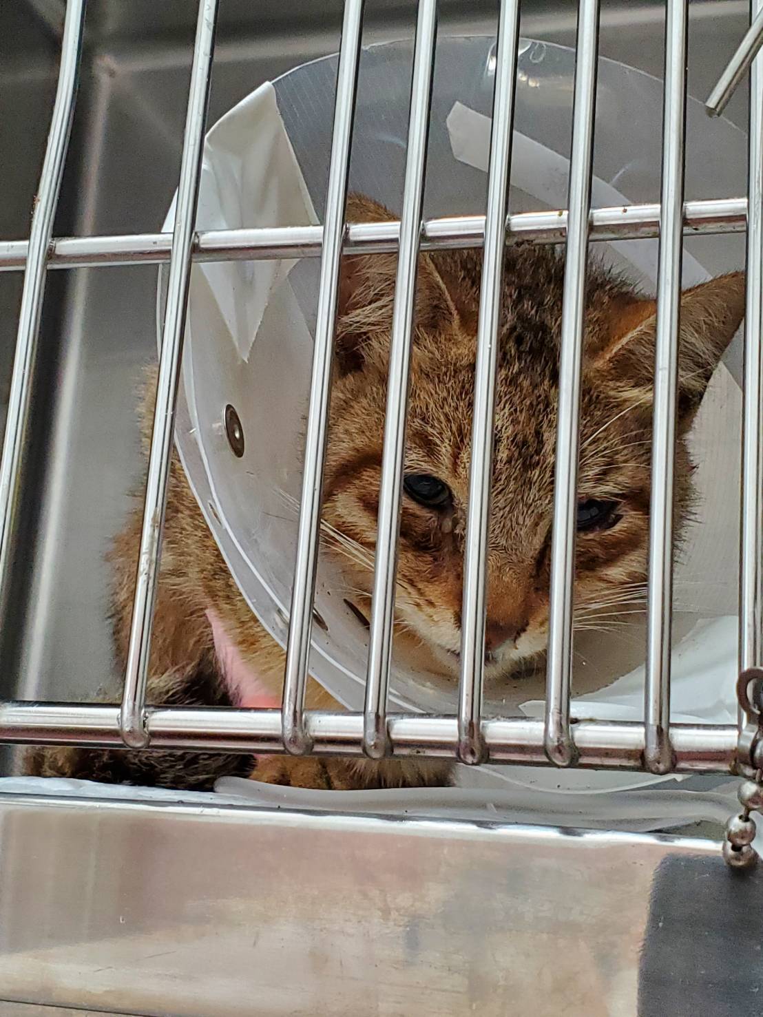 たすきは保護されてその日のうちに手術をしてくださり、その日の夜に我が家に来ました。手術で麻酔をかけている間にノミダニ駆除と駆虫をしてくださったのでとりあえず先住猫と犬もいることから完全隔離出来る場所に。あまり暴れてはいけないと先生に言われたので1段ケージを置いて隔離をすることに。初めてここまで近くで人間を見たのと、捕獲された後手術され怖くて痛いのとで怯えきっていたたすき。猫ベッドの上に寝るのではなく下に隠れるように潜り込んでいました。ドアを閉めていてもたすきの行動がよく分かるようにケージの中にカラカラなるオモチャをぶら下げました。ここから数日夜な夜な寝静まるとたすきのいる部屋からカラン...カラン...と、なる日々が続きました(笑)ある夜たすきの様子を見に行ったときドアを開けると...ケージの外にたすきが...!?私を見たたすきは慌ててケージへ!たすきはなんとケージの隙間からするりと抜け出していたのです!生後約半年2㎏の猫がケージの隙間を抜け出たことには正直驚きました(゜ロ゜;ノ)ノそれからすぐ家にある物でケージの隙間を埋めたのですが、これもまた毎日ケージの中を暴れては出たがるたすきの爪によって引き裂かれ後日ワイヤーネットにてケージをDIY。そんなたすきなので勿論私が近付くと隠れ威嚇。それでも毎日革手袋着用でちゅーるをあげたり触っている日々です。たすきのあだ名がイリュージョニストたすきちゃんになった日です。大変恐縮なのですが、目標金額達成のためプロジェクトのシェア等、皆様のご協力を頂けましたら大変幸いに存じます。恐れ入りますがこちらのリンクをシェアいただければと思います。https://camp-fire.jp/projects/view/310578