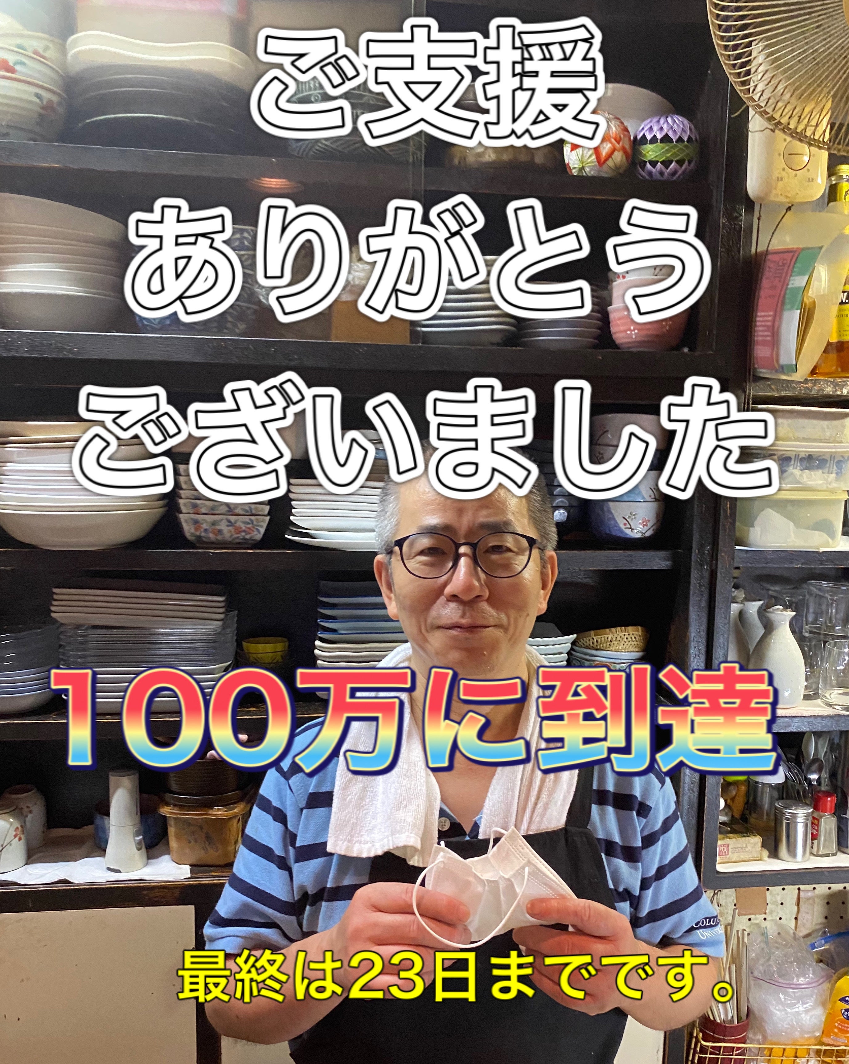 最終日を待たずして、目標額の100万円に到達しました。成功です。ご支援を誠にありがとうございました。感謝でいっぱいです。今 直ちに皆様で集まり、乾杯したい気分です。和田屋に59人はまさしく 3蜜ですね。前回、活動報告後より、メッセージの返信ができなくなりました。御礼のメッセージができず、申し訳ありません。このクラウドファンディング終了後に、皆さまのご連絡先を受け取ることになっております。リターンを発送時に 改めて、報告いたします。 最終日は23日です。すこしでも、多くの資金が和田屋に届きますようお願い申し上げます。文字通り、ごり押しです。Go To トラベル ようやく 東京も 10/1より参加できそうです。withコロナのNew Normal マスク 手洗い 3蜜を避ける 健康でいることと 私は思っています。和田屋で乾杯できる日を楽しみにしております。皆様 どうぞ、健康で元気にお酒を飲める状態にしていましょう