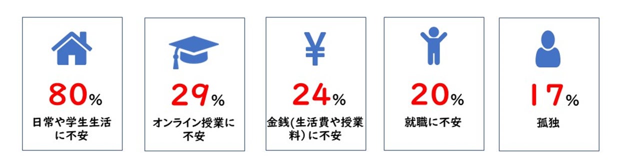 その結果、学生の約8割が「日常や学生生活に不安がある」と答えました。不安の具体的な内容別(複数回答)は、「オンライン授業」が29%で最多。次いで「金銭(生活費や授業料)」が24%。「就職」が20%で、「孤独」が17%でした。