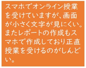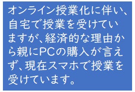 私たちは新型コロナに関する学生に向けた緊急のアンケート調査(2020年4月25日に実施:290名回答)を行いました。その中で具体的かつ深刻な課題が浮き彫りになってきました。大学等ではオンライン授業が、また就職活動においてはオンラインによる会社説明会が主流になりました。一方で、経済的理由等によりパソコン(以下、PC)がない、Wi-Fiなどの通信環境が不十分な中での授業や就活をしている学生がいること。さらに通学ができず、パケット代の関係から長時間ネットにつなぐことができず、新たなコミュニティの構築(友達作り)ができず「孤独」の学生生活を過ごしていることもわかりました。