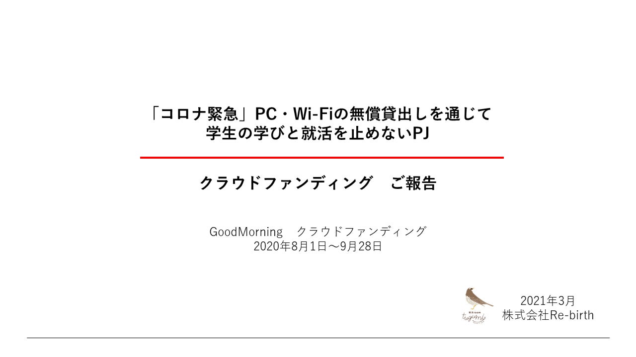 2021/03/31 18:51みなさん、こんにちは。株式会社Re-birthの竹林です。多大なご支援を賜り誠にありがとうございました。さて、本来ですと5月に結果報告書をお送りする予定でしたが、皆さまのご協力により年度末にご報告することが出来ました。今後も引き続き、学生の学びと就活を止めない取り組みを続けて参りますので、どうぞこれからもご協力賜りますようにお願い申し上げます。 もっと見る