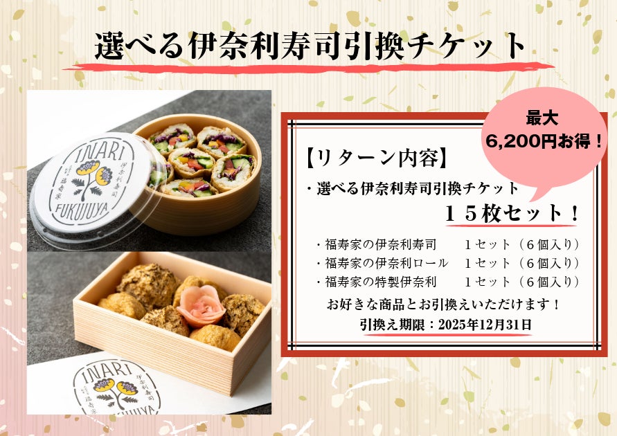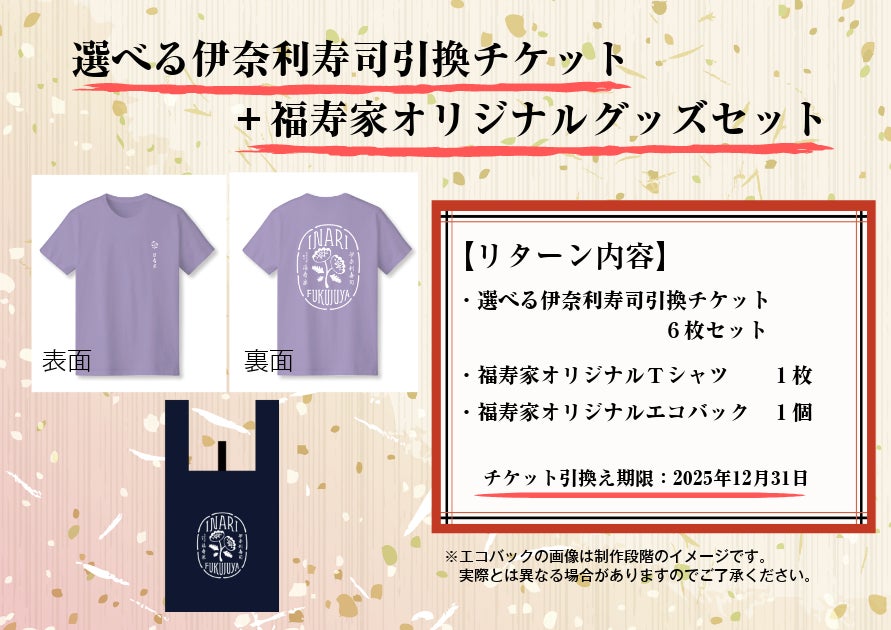 お好みの伊奈利寿司1セットとお引換えいただけるチケット6枚と、福寿家オリジナルグッズセット(オリジナルTシャツ、エコバック)をお届け致します。チケットをご使用の際は、お取り置き致しますので御来店いただける日時を事前にご連絡ください。