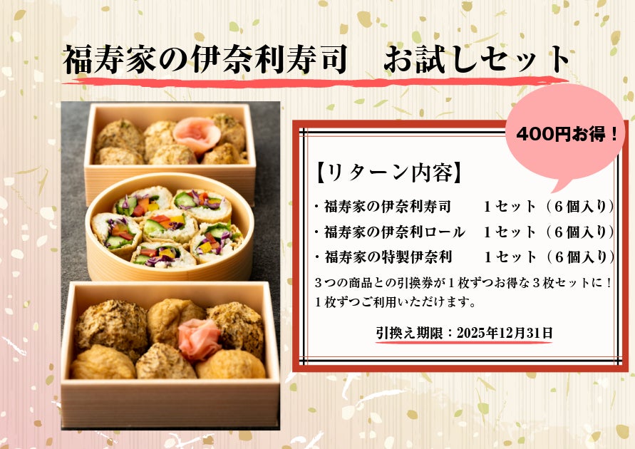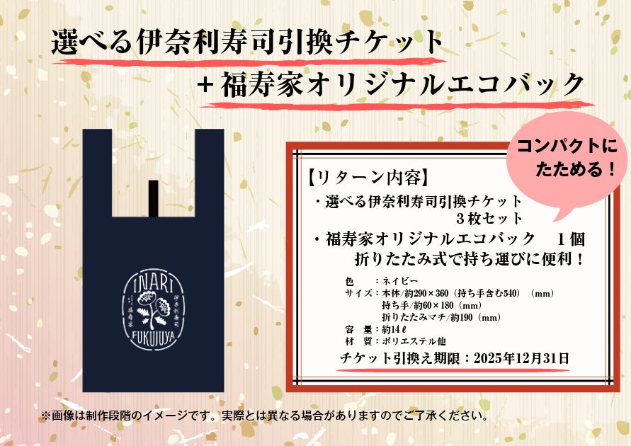 お好みの伊奈利寿司1セットとお引換えいただけるチケット3枚と、持ち運びに便利な折りたたみのできる福寿家オリジナルエコバックをセットでお届けします。チケットをご使用の際は、お取り置き致しますので御来店いただける日時を事前にご連絡ください。