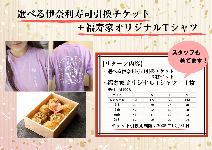 お好みの伊奈利寿司1セットとお引換えいただけるチケット3枚と、店舗スタッフも着用している福寿家のロゴがプリントされたオリジナルTシャツをセットでお届けします。チケットをご使用の際は、お取り置き致しますので御来店いただける日時を事前にご連絡ください。