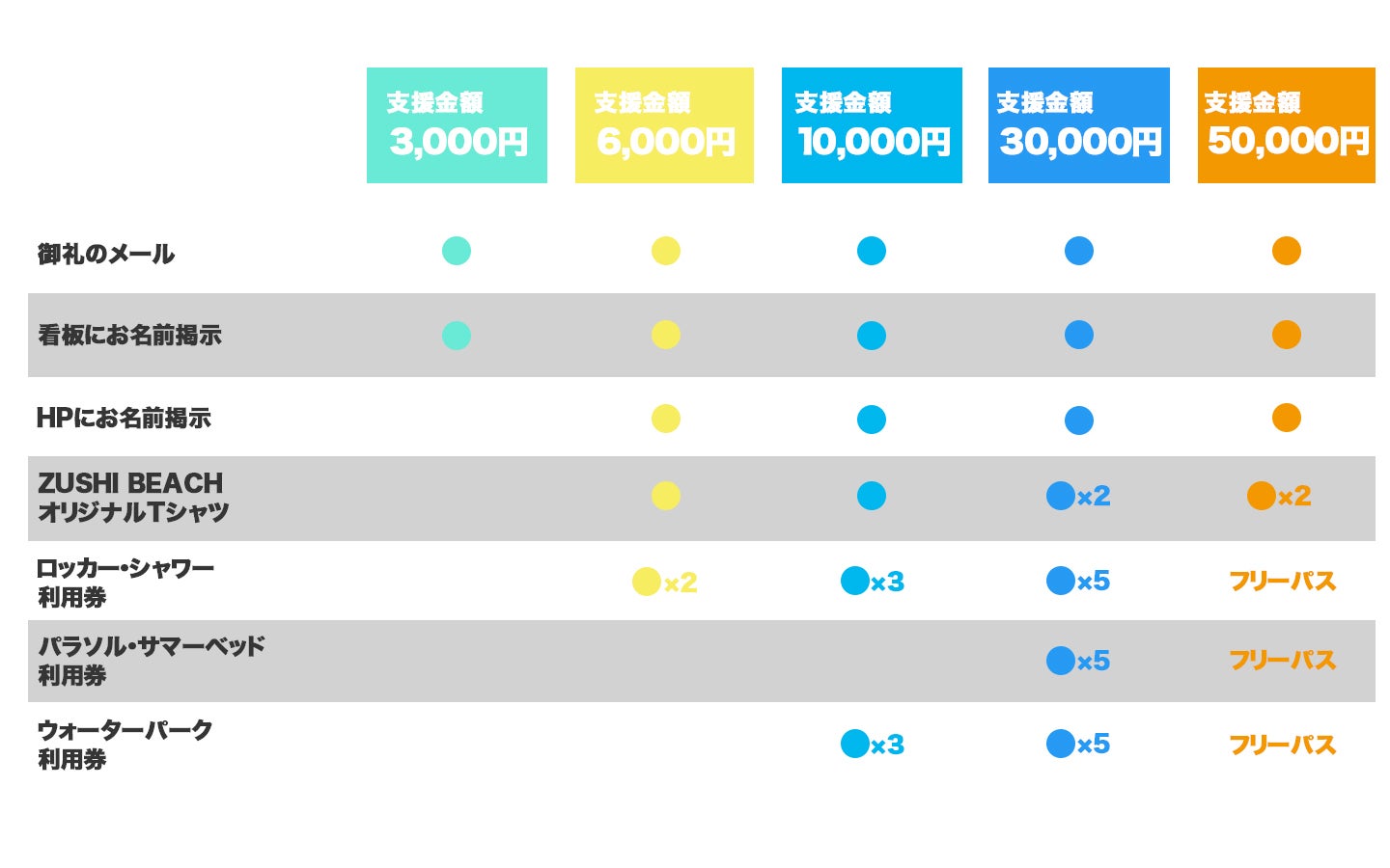 2021年海の家やウォーターパークをお得にご利用いただける利用券や看板・ホームページへのお名前掲示、オリジナルTシャツなど、心を込めてご用意いたしました。