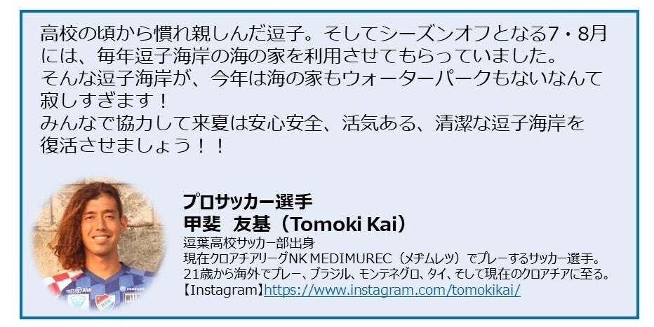 今年の海水浴場にはシャワーもなければゴミステーションもありません。ライフセーバーが常に見守ってくれている状況でもありません。どうか今年は密集することのない逗子海岸を守っていただきたく、またゴミなど持ち込むことのないように、心よりお願い申し上げます。私たちも来年また皆様とお会いできるまで、安心安全で美しいビーチを守り続けることをお約束します。