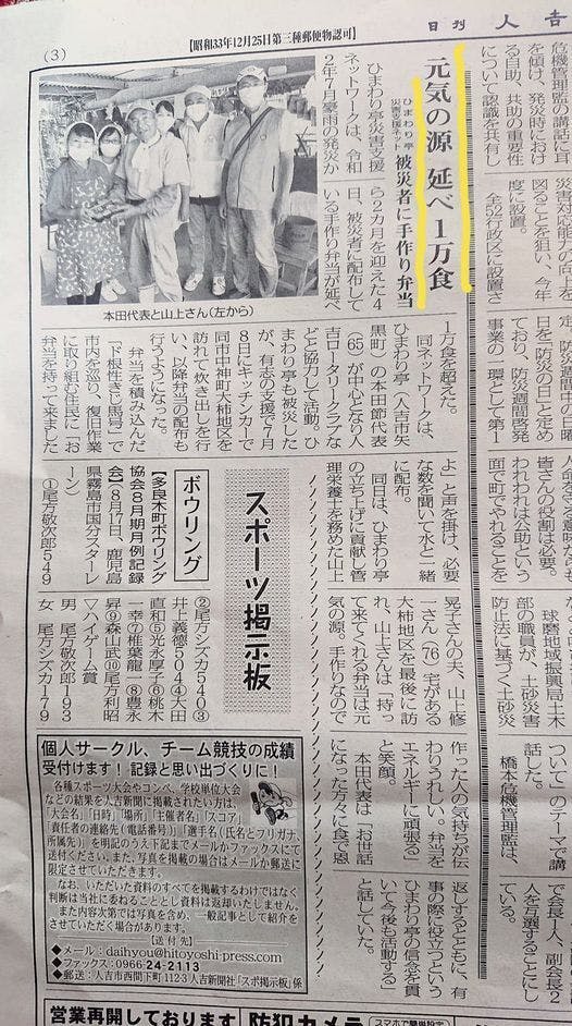 9月7日 人吉新聞にひまわり亭の活動を取り上げていただきました。