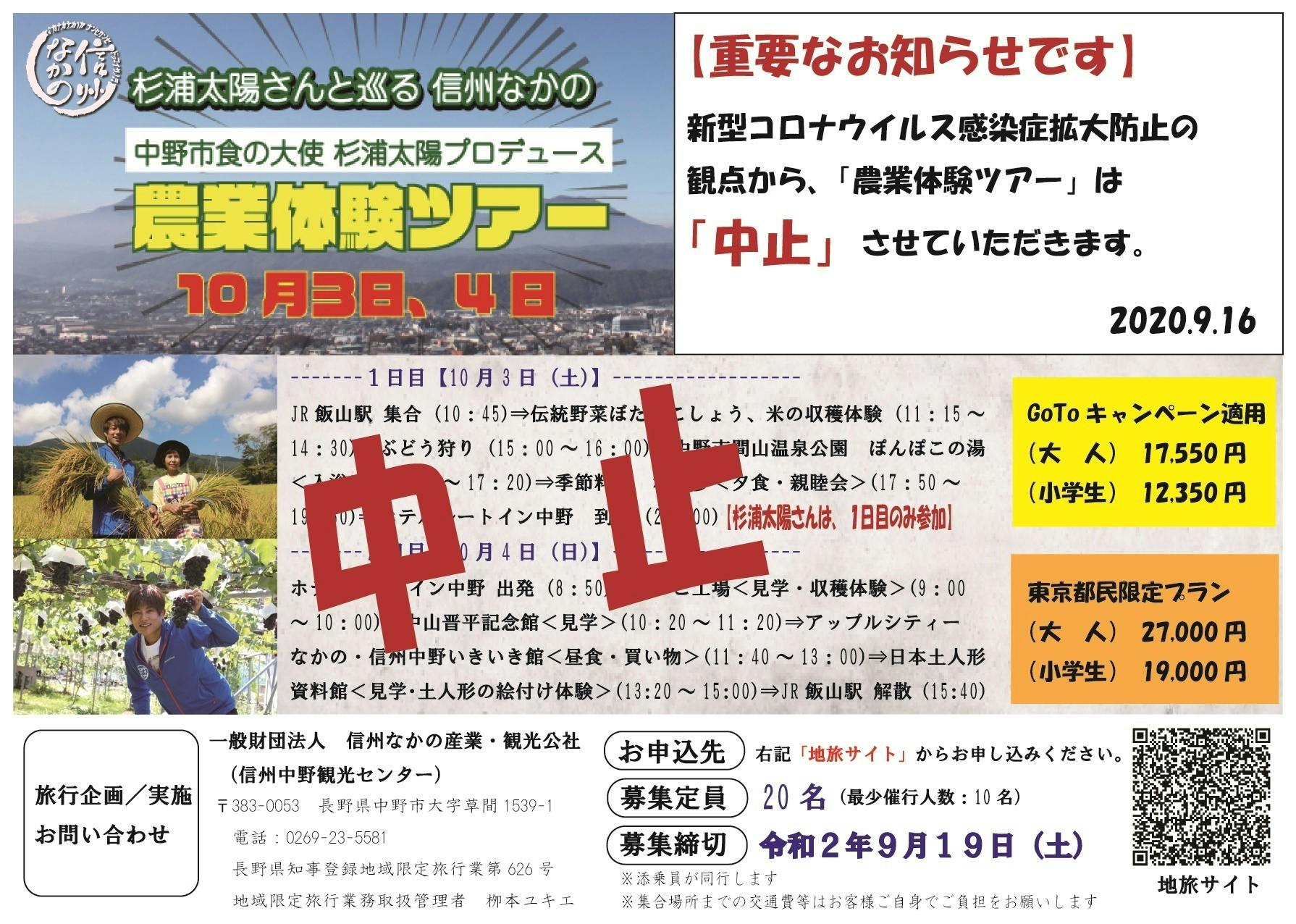 『中野市食の大使 杉浦太陽 プロデュース 旬の農産物収穫ツアー』 (10月3日~4日)について、新型コロナウイルス感染症拡大防止の観点から、 「中止」とさせていただきます