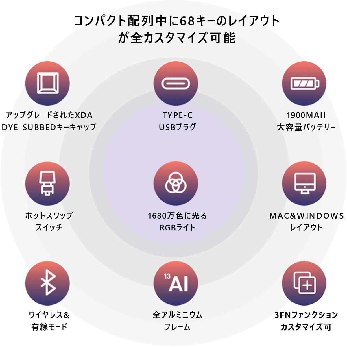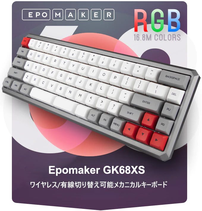 GK68XSは、タイピングを好むあなたのために設計されました。私たちは、本プロジェクトを通して世界中のメカニカルキーボード愛好家・コミュニティと連絡を取り合い、可能な限り最高のキーボードを設計する努力を続けてきました。1年以上に及ぶ開発を経て完成したこのメカニカルキーボードGK68XSをご紹介させていただきます。 GK68XSは、68キー搭載の完全カスタマイズ可能なコンパクトデザインのメカニカルキーボード。デュアル接続モード(ワイヤレスまたは有線)搭載、WindowsとMacの両方のレイアウトに対応しておりあらゆるデバイスとのセットアップに最適。同時に最大3つのデバイスと接続することができます。