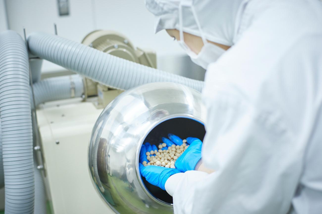 「ヘーゼル香る とろりんショコラ」はグミにチョコレートをまとわせた、ボール型のお菓子。雪だるまをつくる要領で、回転する窯の中に核となるグミを入れ、そこに液状化したチョコレートをかけて、丸い形に仕上げていきます。つくり終わるまでにかかる時間は、なんと2時間!