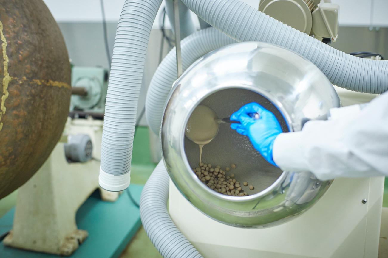 チョコレートが規定の大きさになったら、チョコがけ作業は終了。パウダーをかけて仕上げていきます。このパウダー、少な過ぎれば粒同士がくっついてしまう原因になり、多過ぎればチョコレートの味わいを邪魔してしまいます。そのため、職人はここでも、適量を見極め、ベストな量を窯の中に投入します。