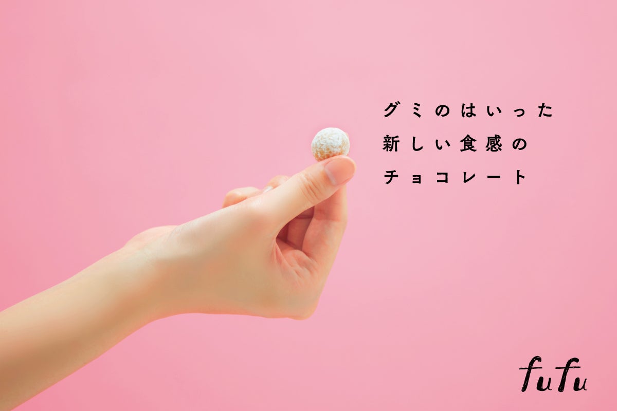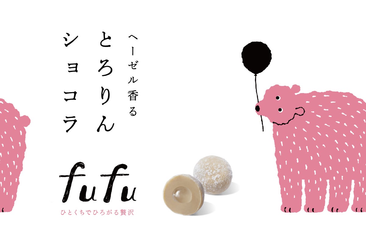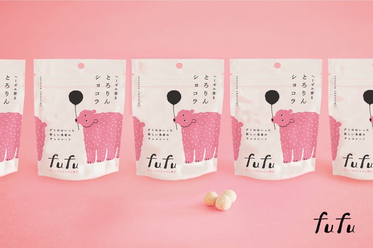 2020年11月に発売される「ヘーゼル香る とろりんショコラ」は「fufu」の記念すべき第1号商品。やわらかくとろける口当たりと、ヘーゼルナッツの豊かな香りが特徴のチョコレートに、小粒でもしっかりと食べ応えのあるグミを合わせた、ほかにはない新食感のお菓子です。
