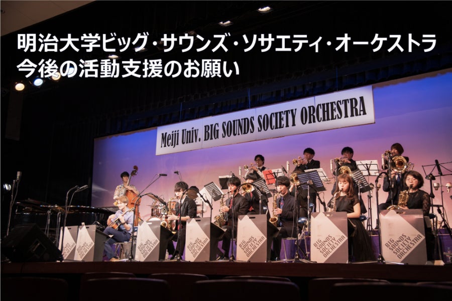 明治大学 Big Sounds Society Orchestra(通称BS)は、明治大学軽音楽クラブ内のビッグバンド(※)として1961年に活動を始めた明治大学の公認サークルです。現在は軽音楽部から独立し、部員約60名で活動しています。